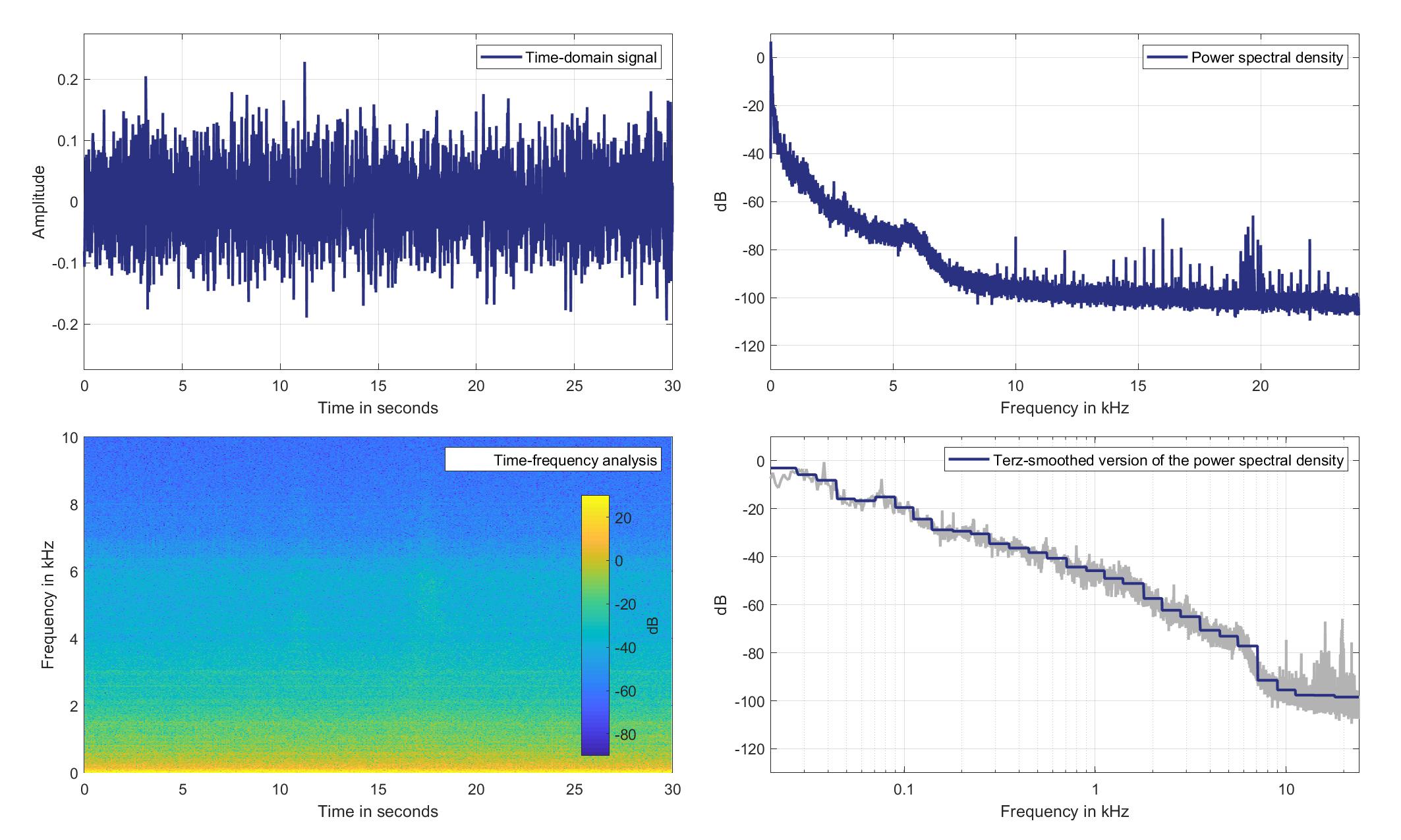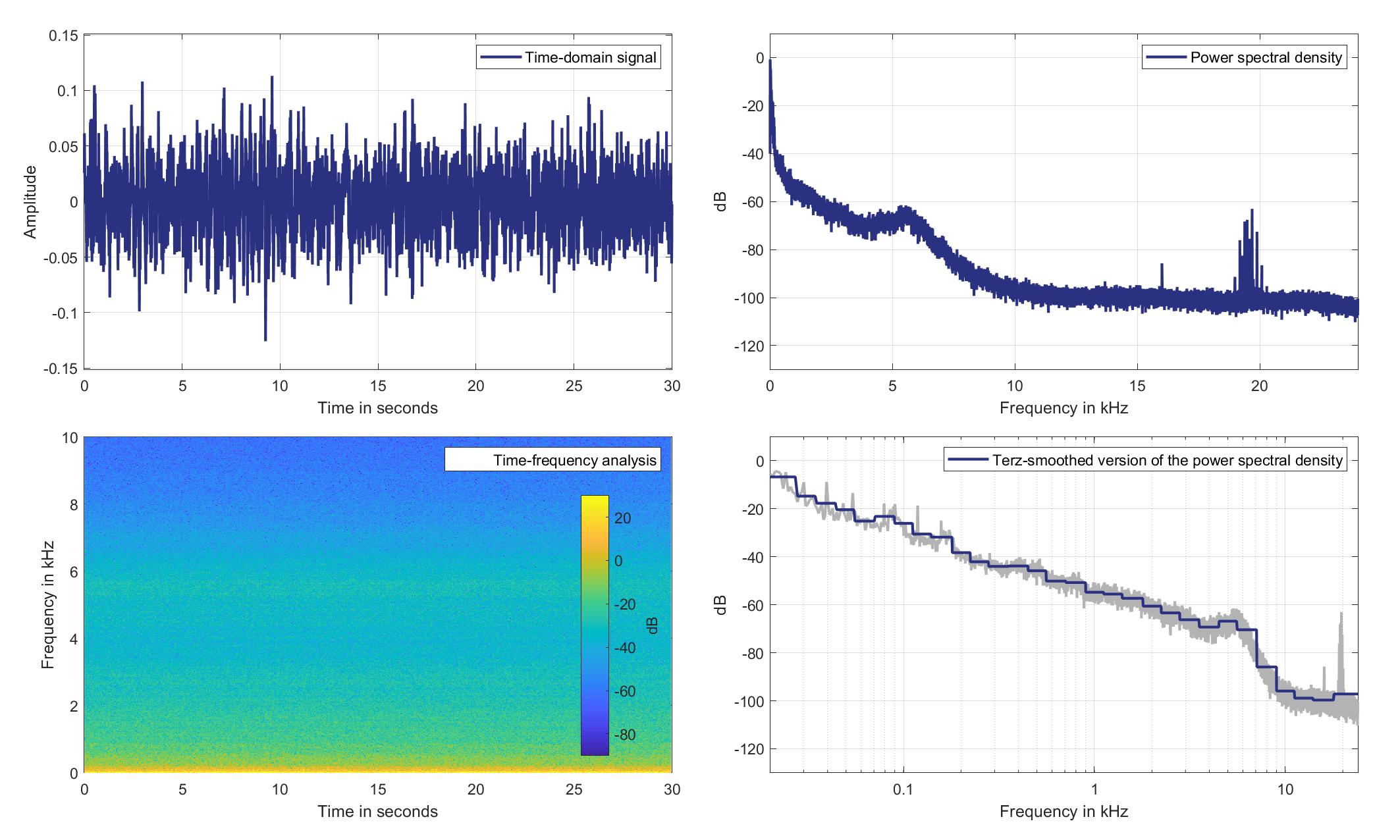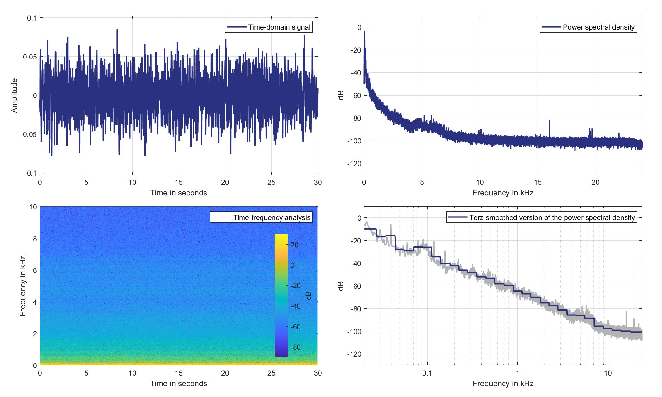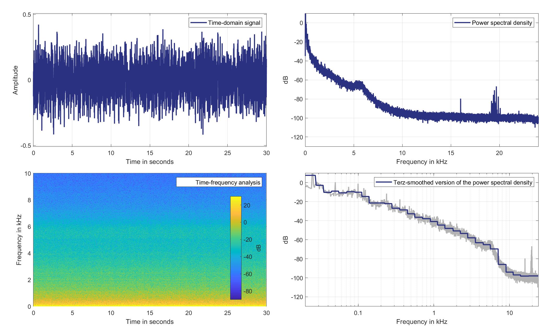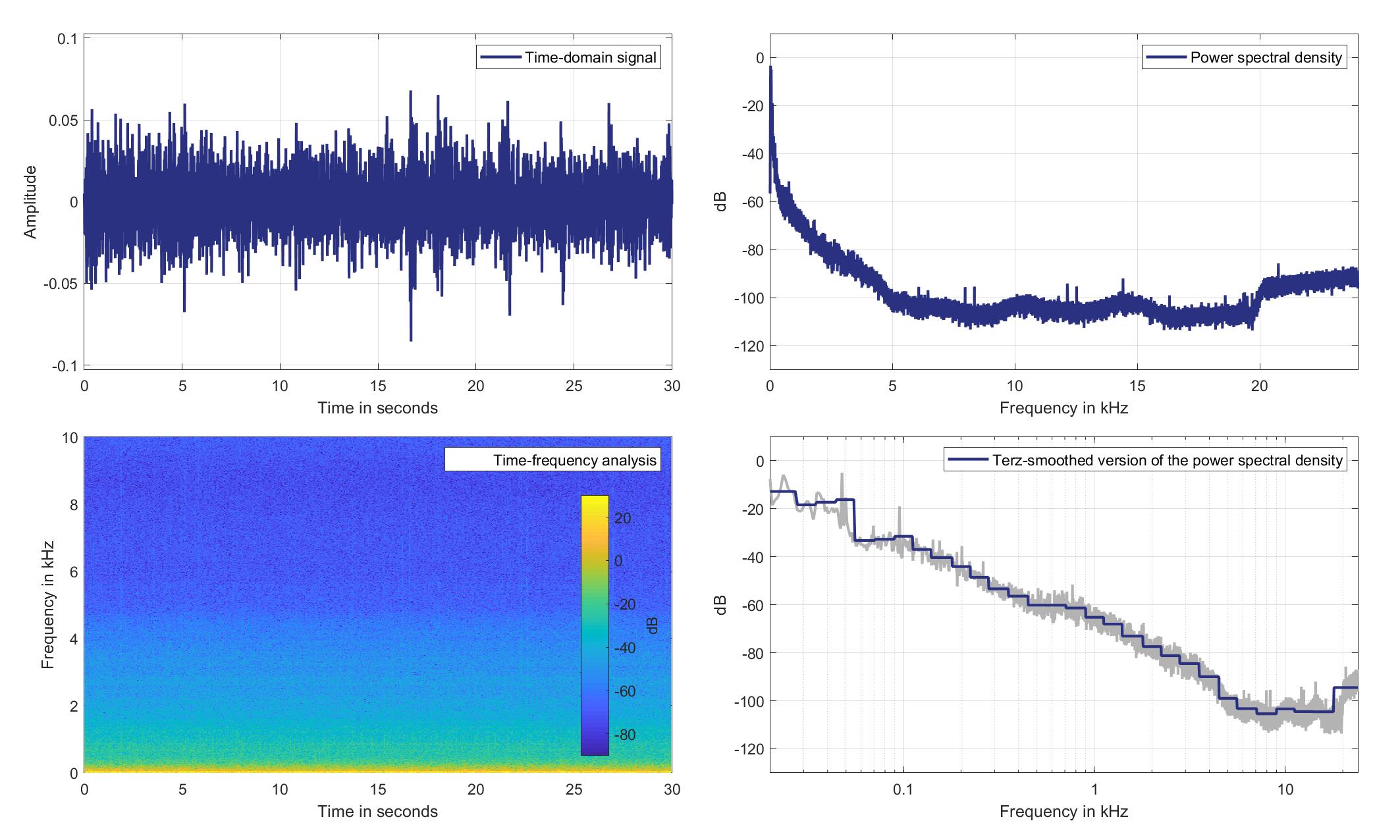 All recordings are presented below in four different analyses per microphone and condition. The first plot shows the time-domain signal and the second one a time-frequency analysis. In the third diagram you can see an estimate of the power spectral density and the last one shows the terz-smoothed version of the power spectral density. Furthermore, you can listen to each noise example for each microphone and situation. The wav files can be downloaded below as single files or in a zipped version of all files in the section "Downloads".