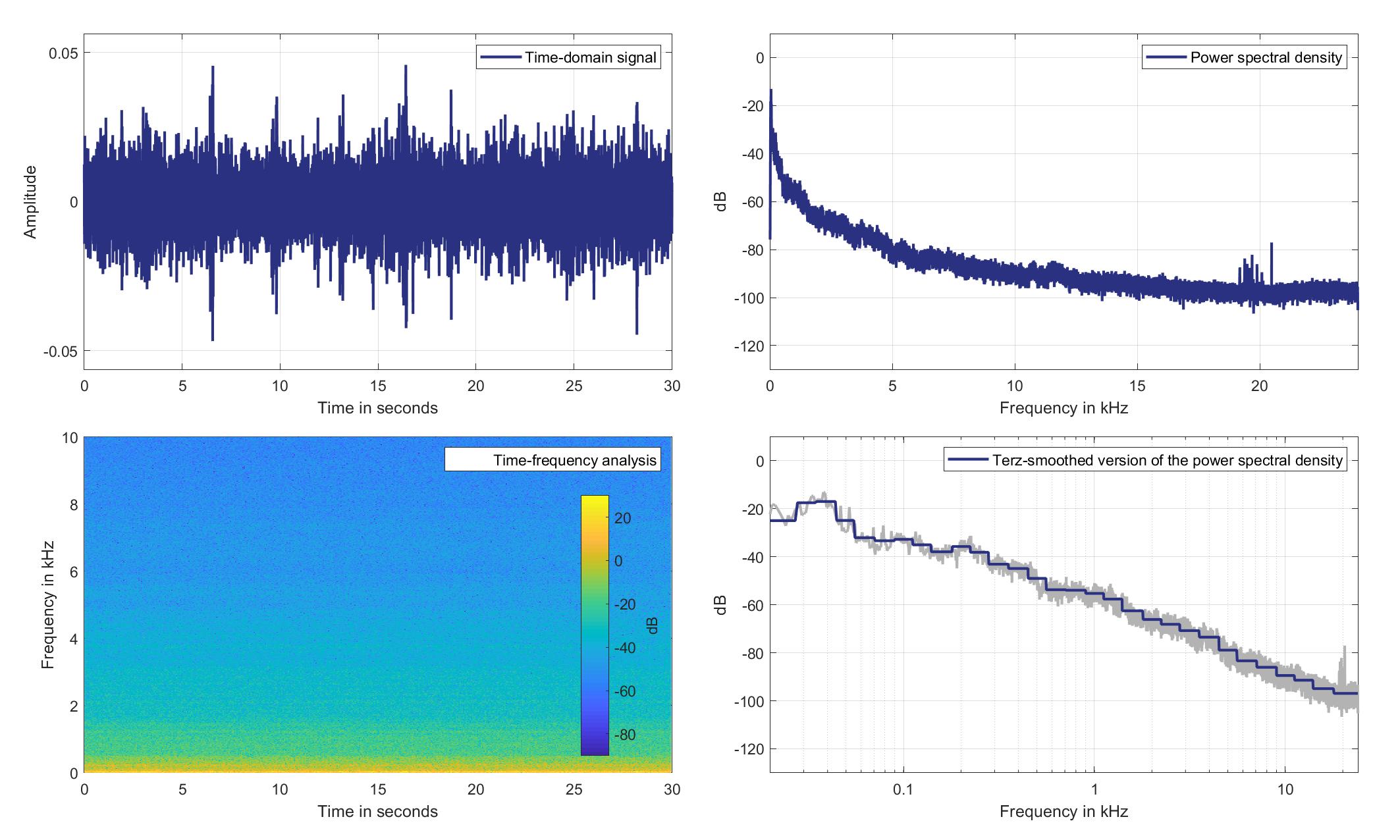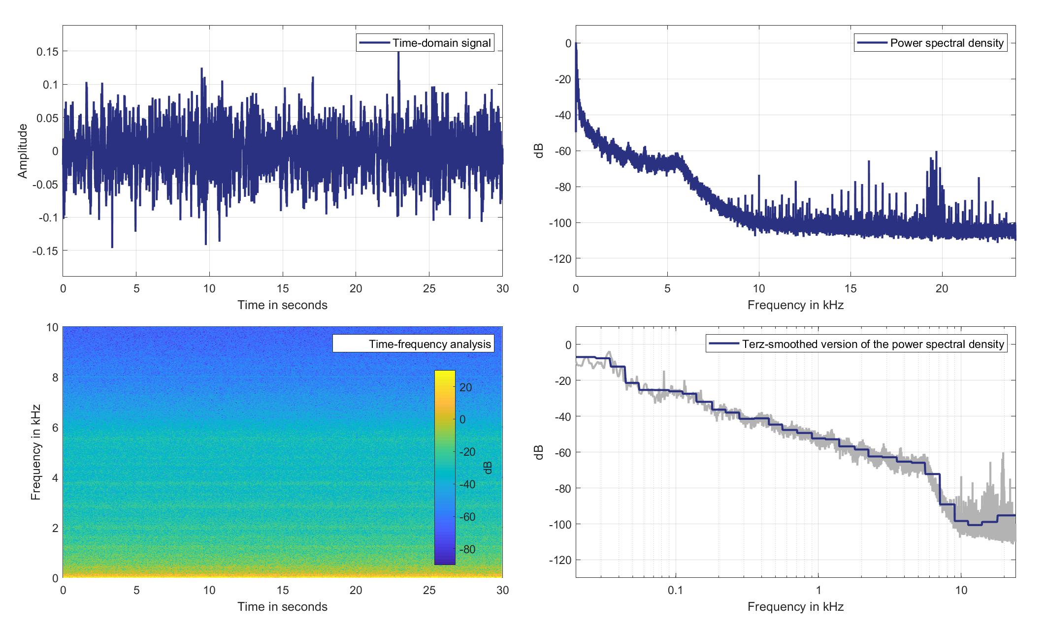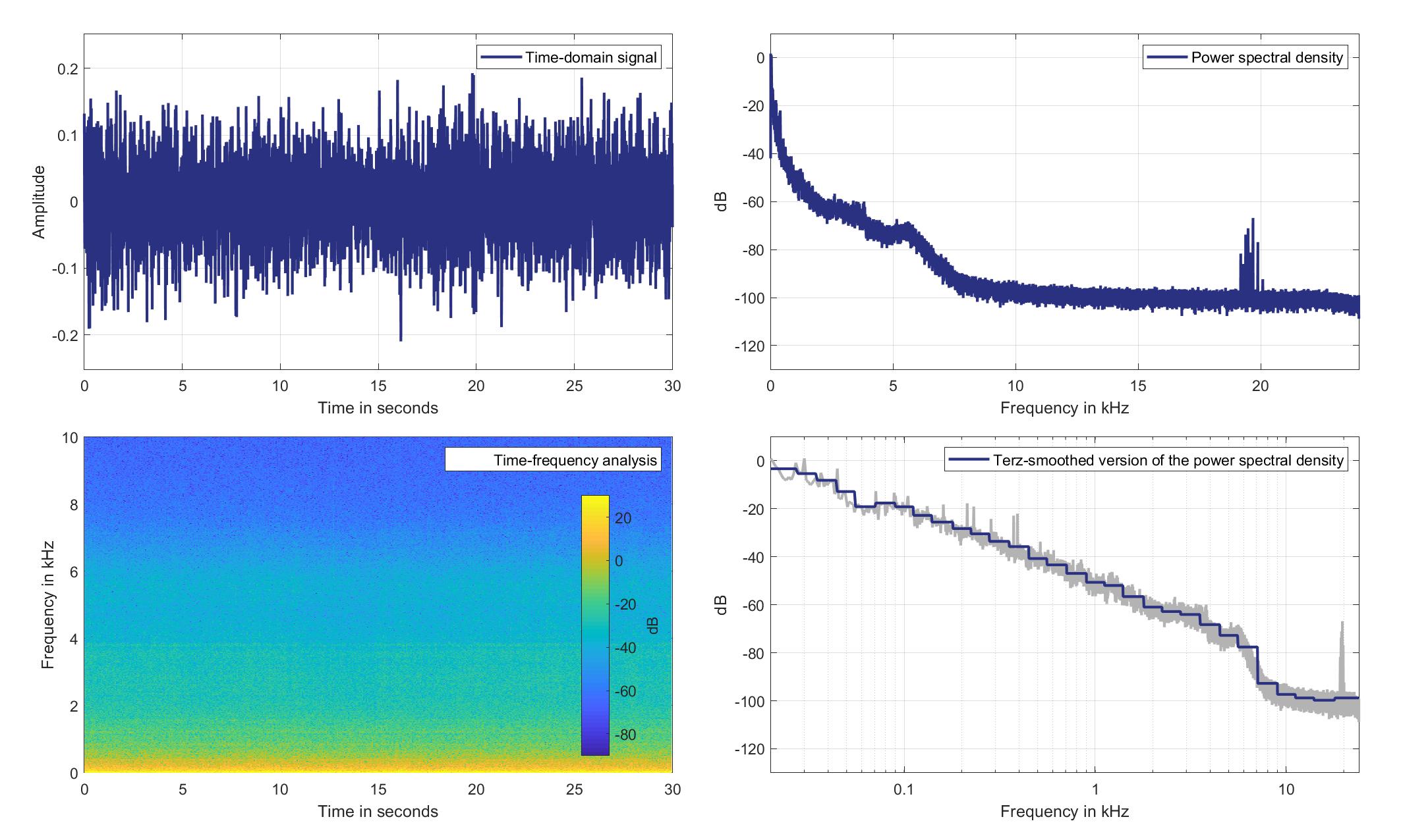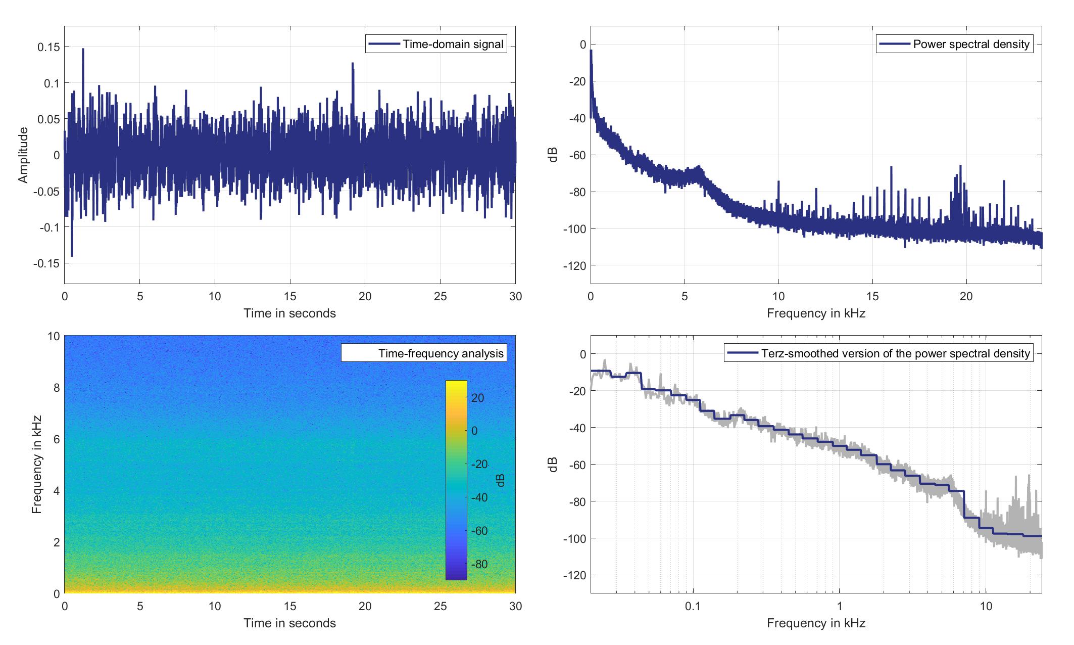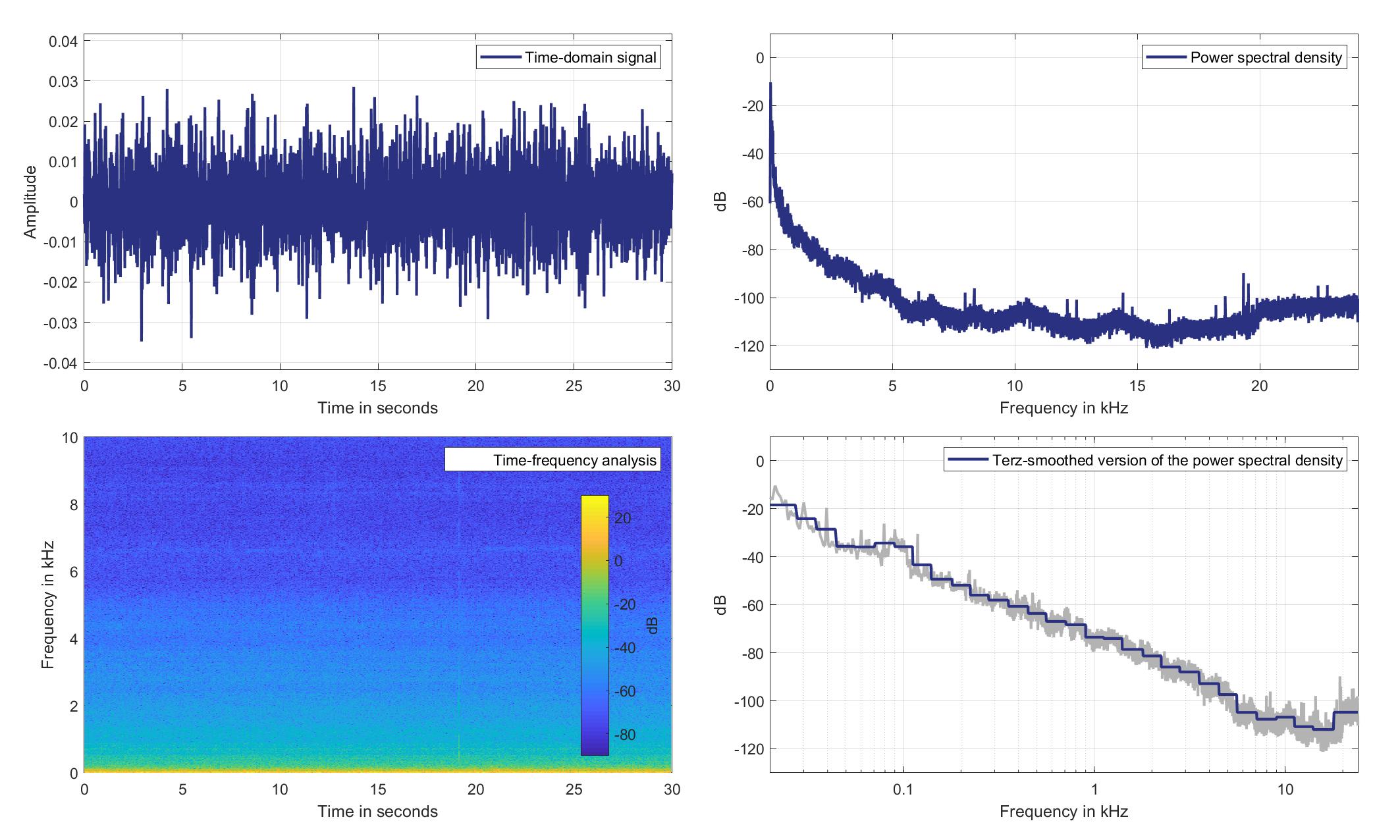 All recordings are presented below in four different analyses per microphone and condition. The first plot shows the time-domain signal and the second one a time-frequency analysis. In the third diagram you can see an estimate of the power spectral density and the last one shows the terz-smoothed version of the power spectral density. Furthermore, you can listen to each noise example for each microphone and situation. The wav files can be downloaded below as single files or in a zipped version of all files in the section "Downloads".