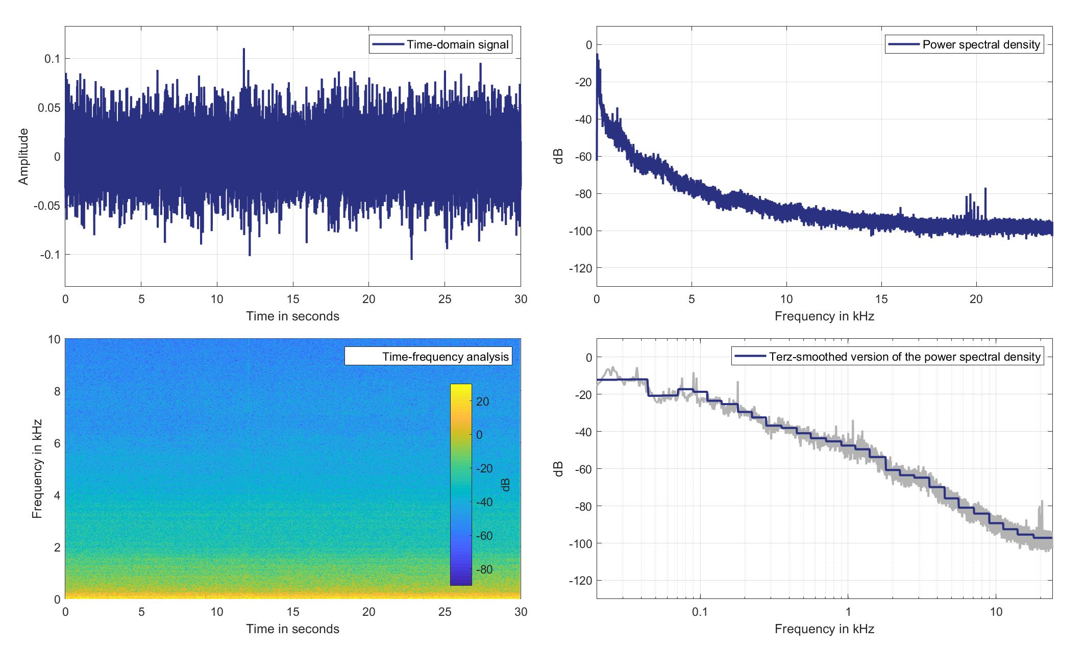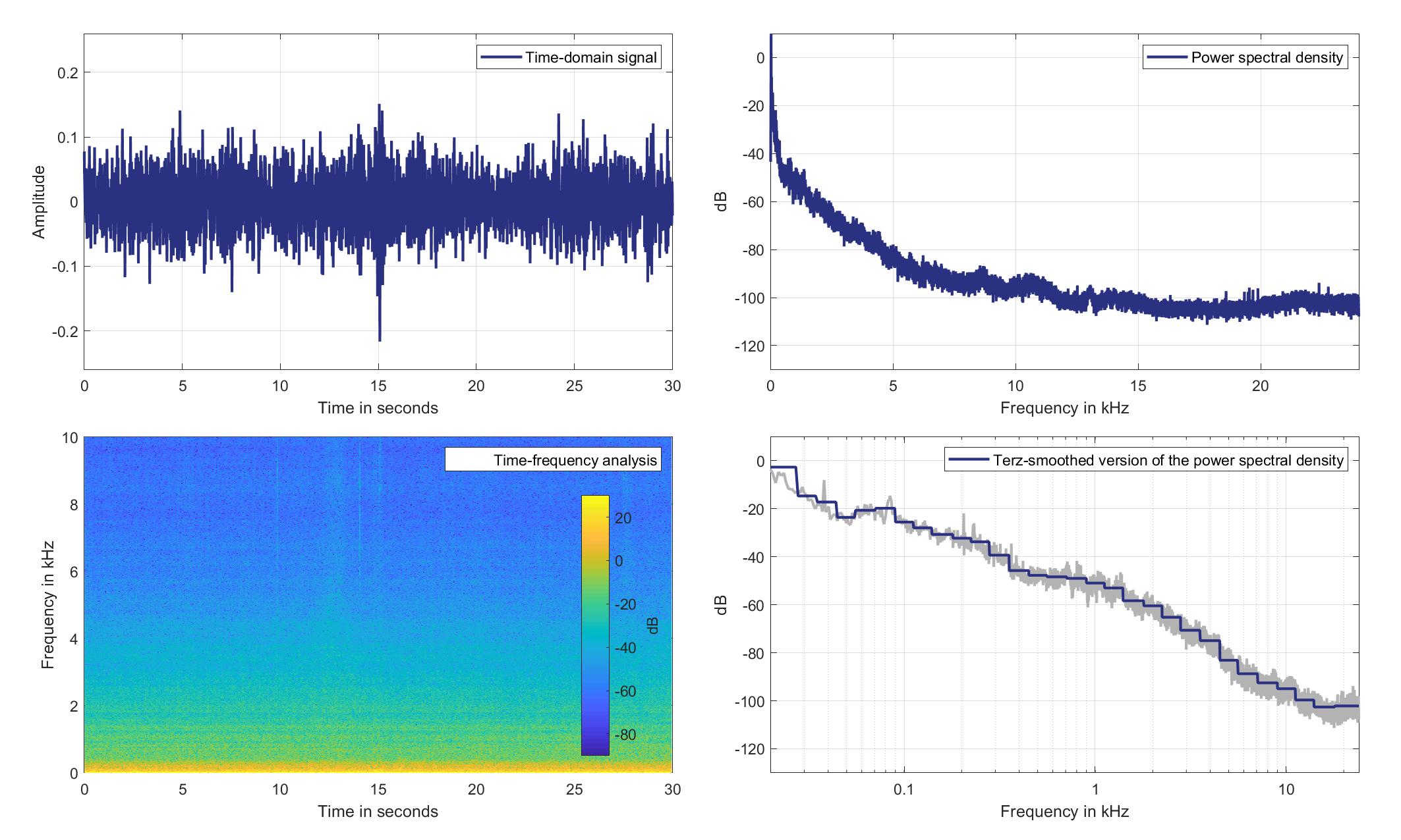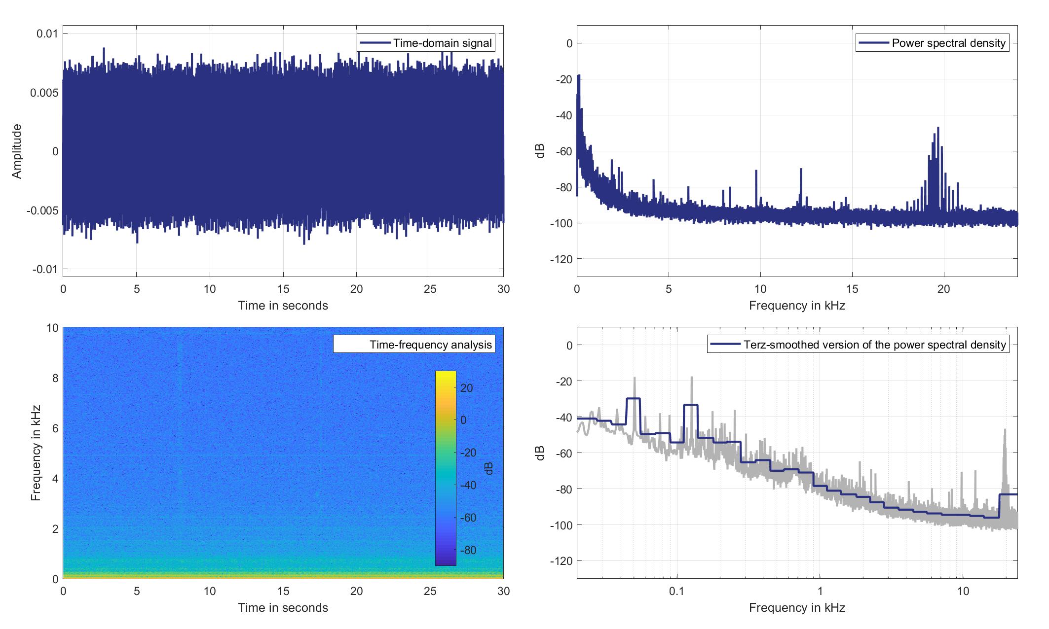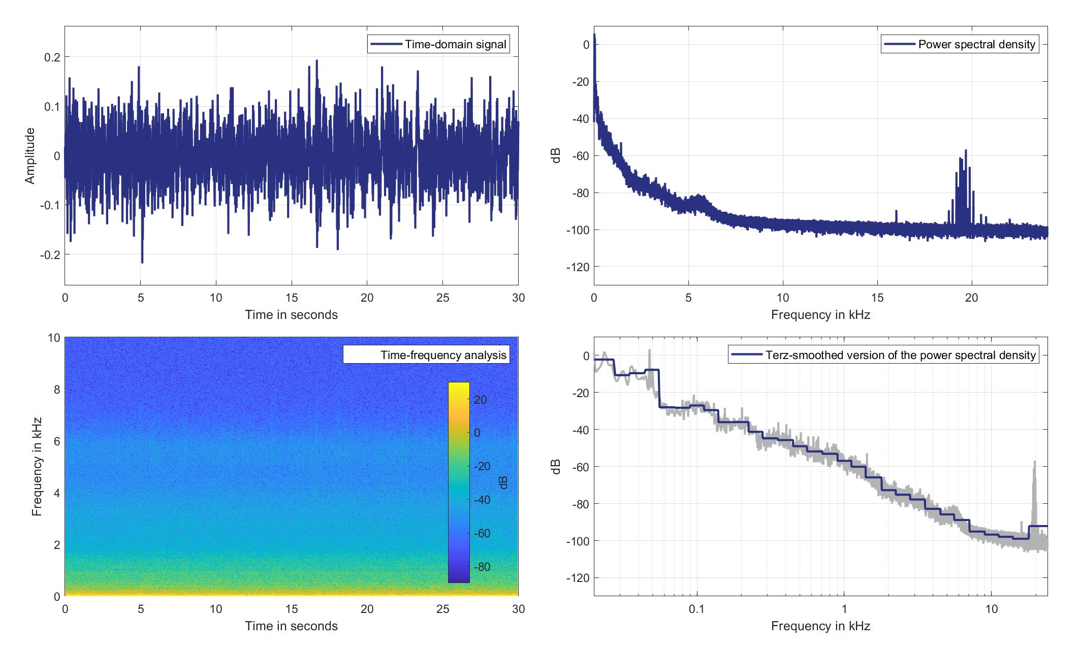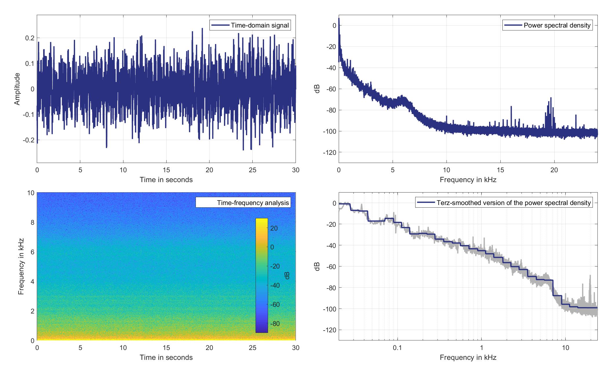 All recordings are presented below in four different analyses per microphone and condition. The first plot shows the time-domain signal and the second one a time-frequency analysis. In the third diagram you can see an estimate of the power spectral density and the last one shows the terz-smoothed version of the power spectral density. Furthermore, you can listen to each noise example for each microphone and situation. The wav files can be downloaded below as single files or in a zipped version of all files in the section "Downloads".