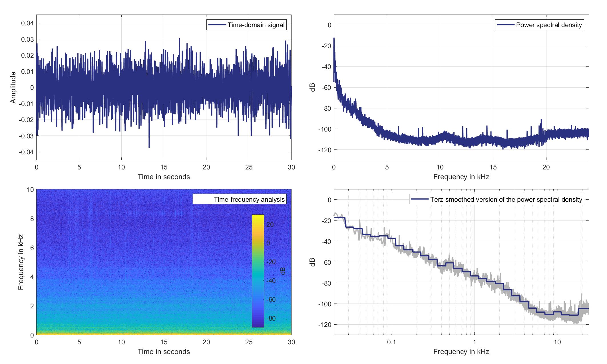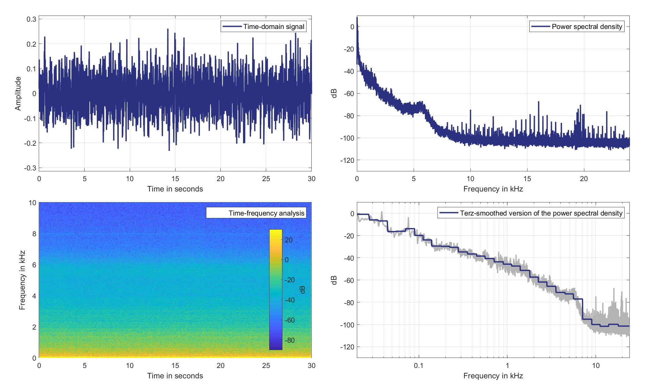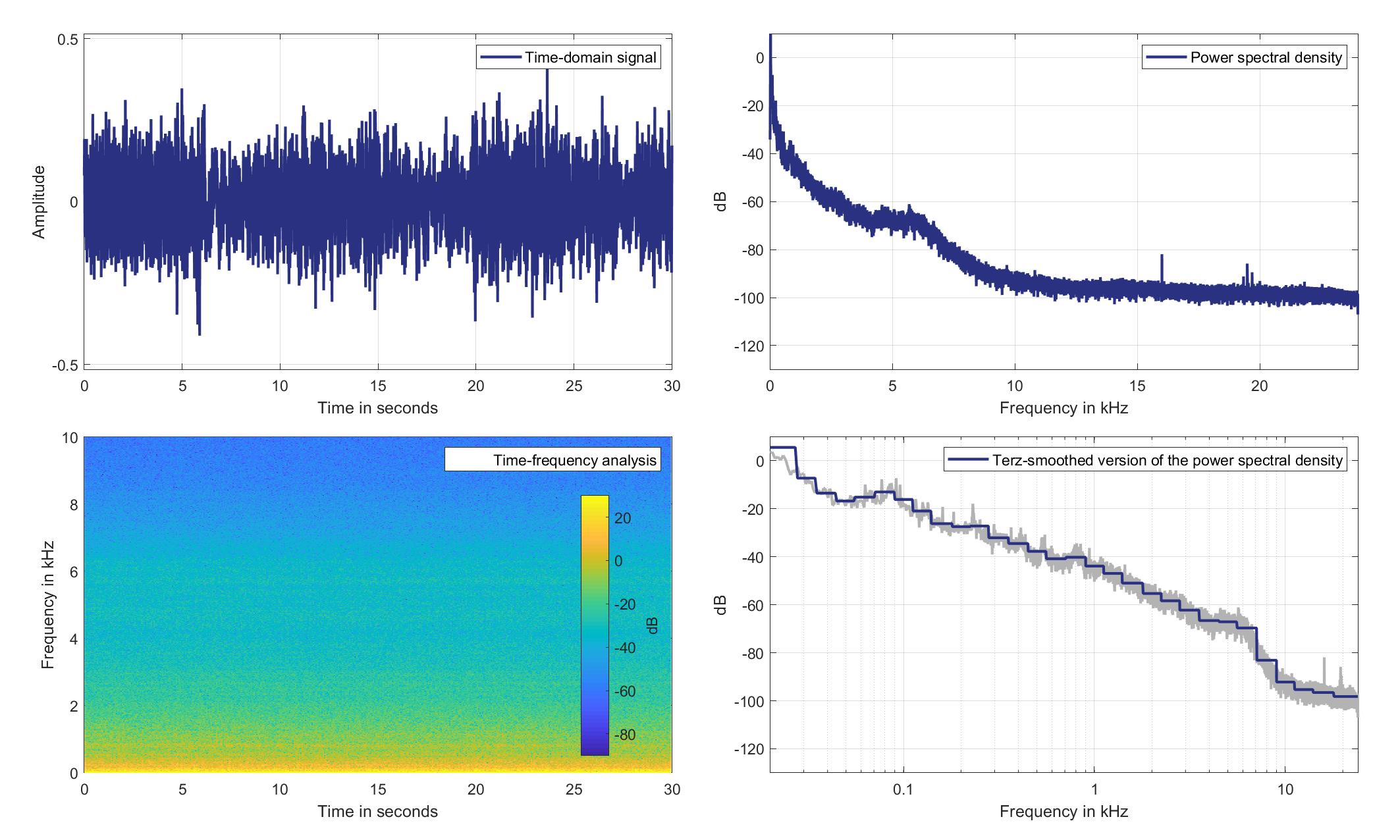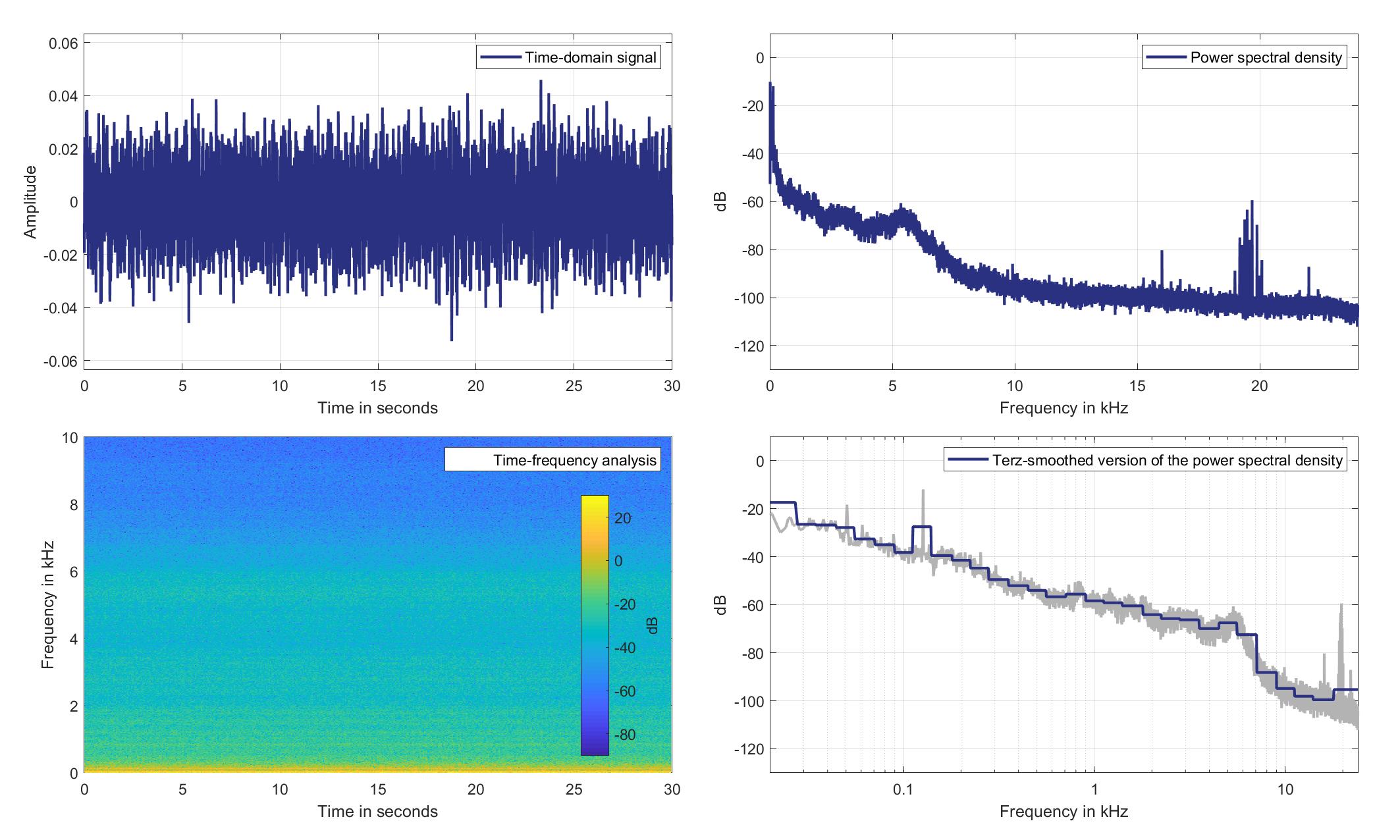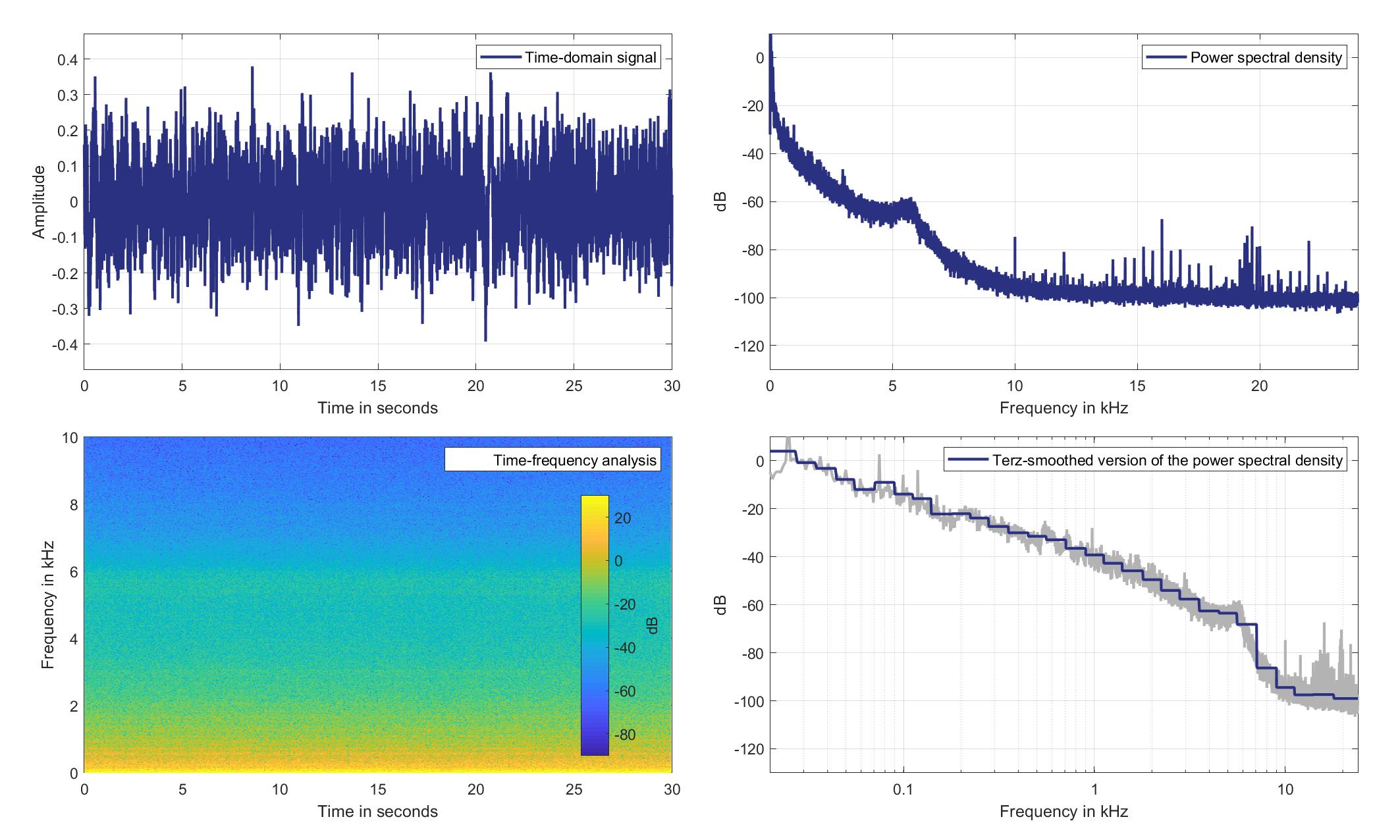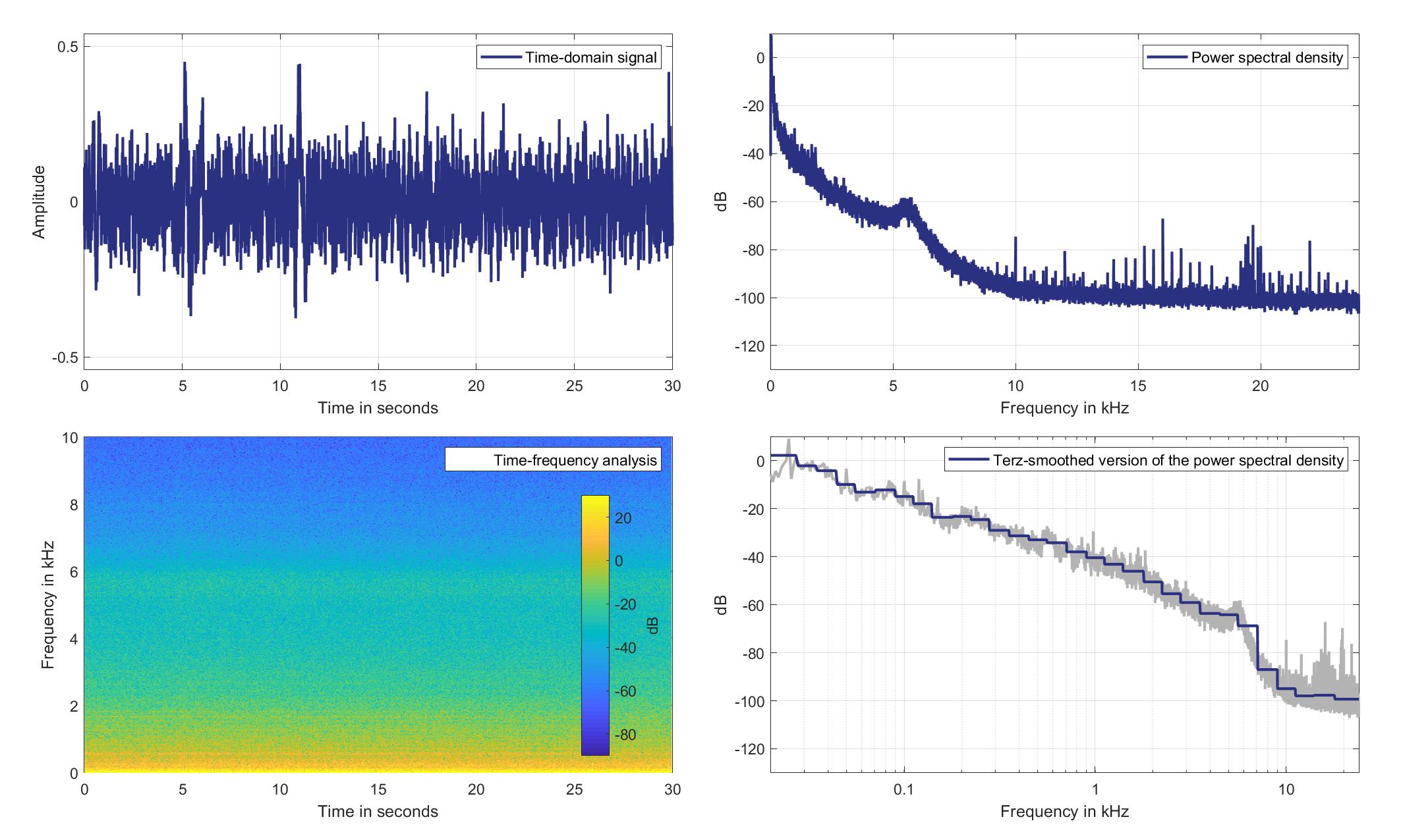 All recordings are presented below in four different analyses per microphone and condition. The first plot shows the time-domain signal and the second one a time-frequency analysis. In the third diagram you can see an estimate of the power spectral density and the last one shows the terz-smoothed version of the power spectral density. Furthermore, you can listen to each noise example for each microphone and situation. The wav files can be downloaded below as single files or in a zipped version of all files in the section "Downloads".