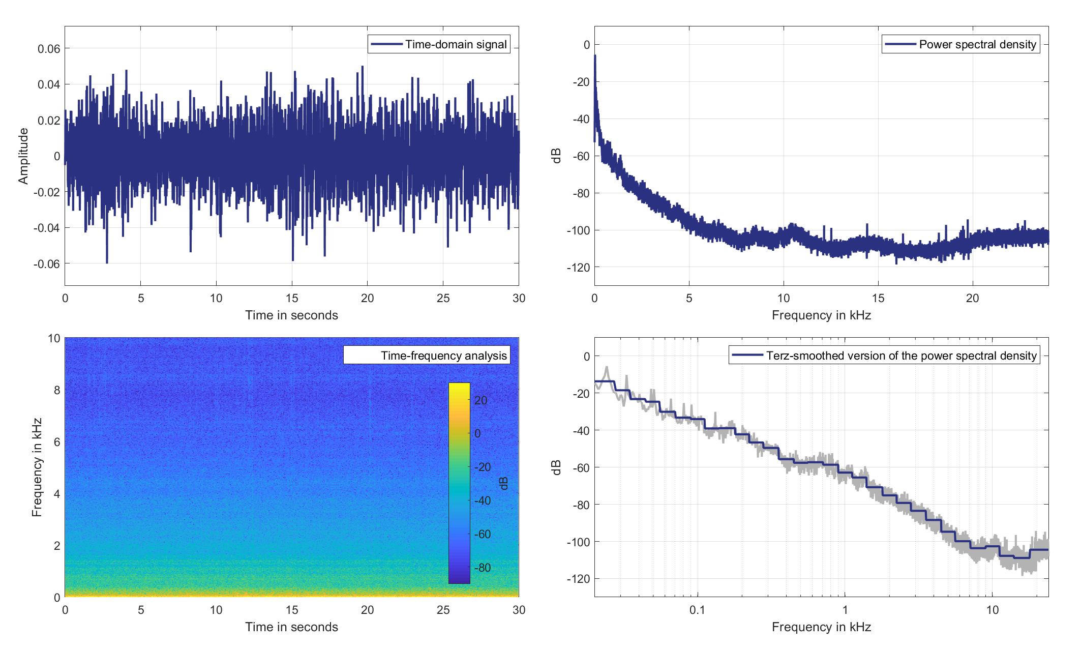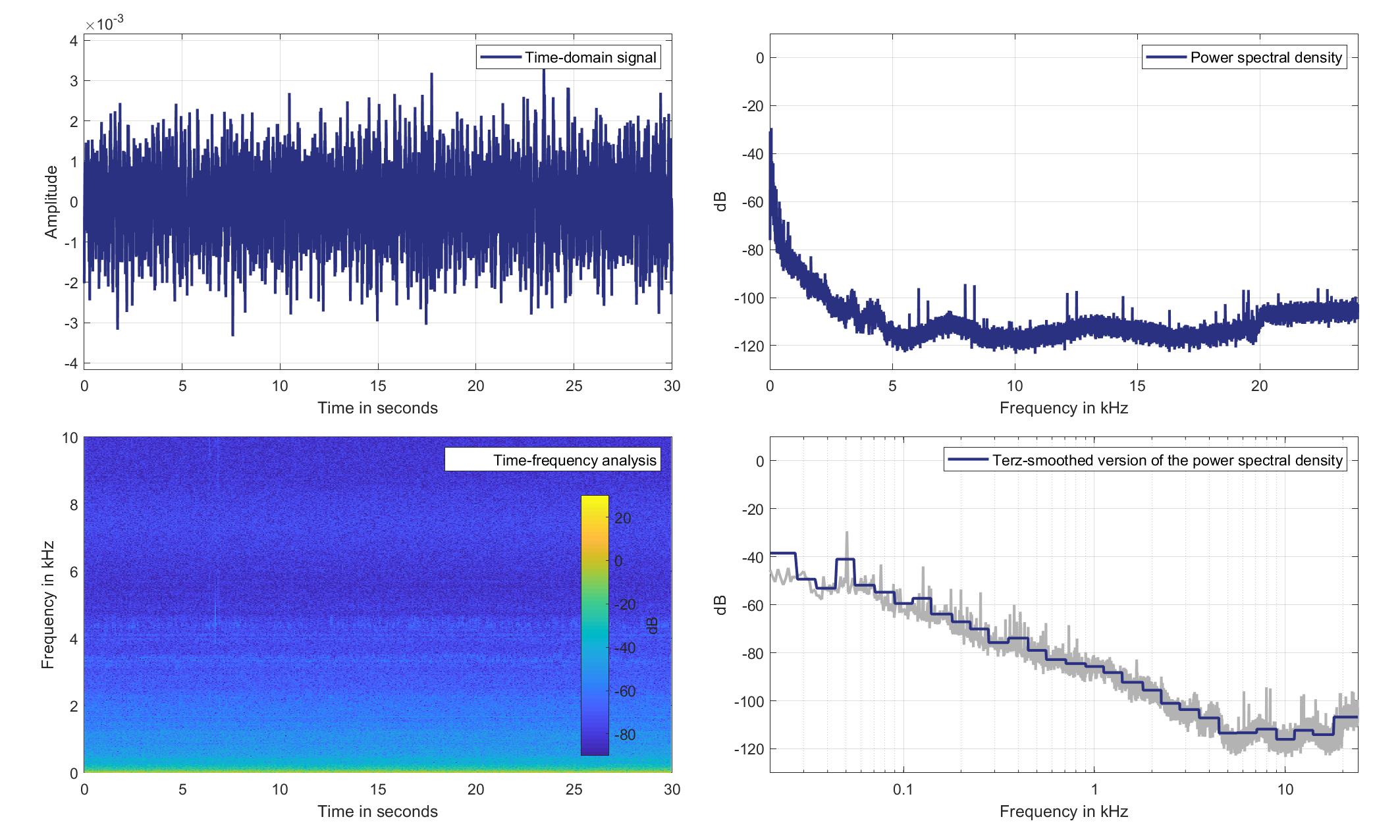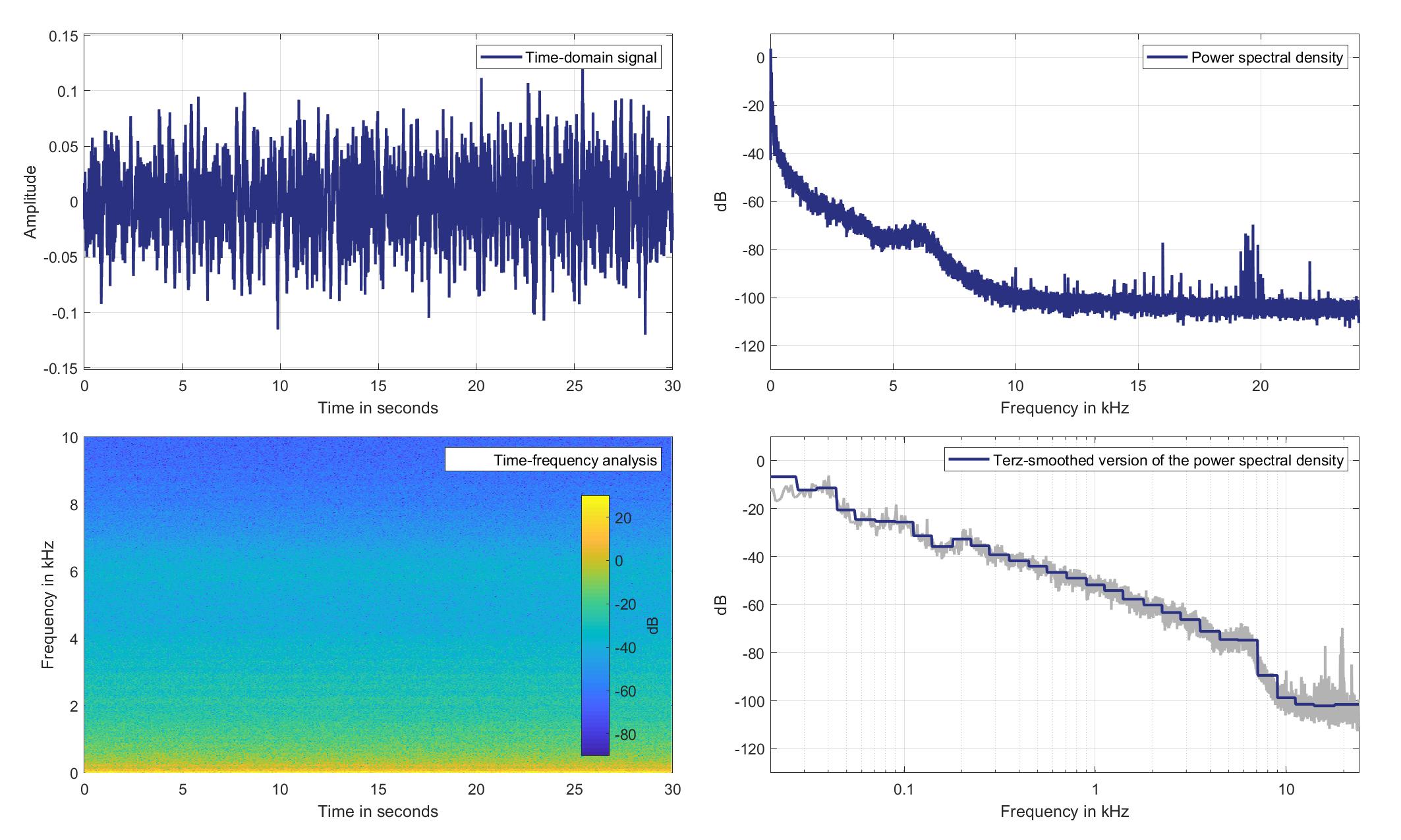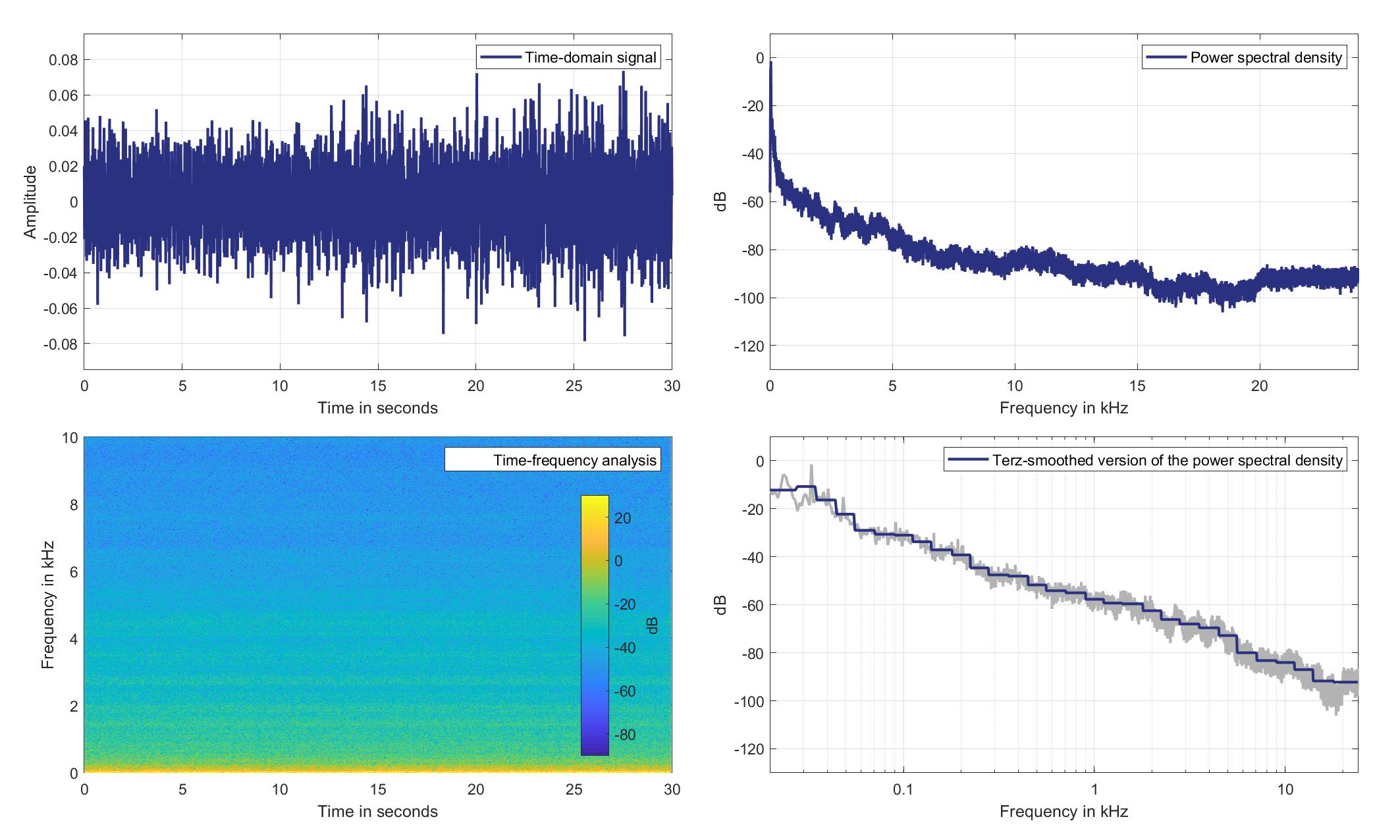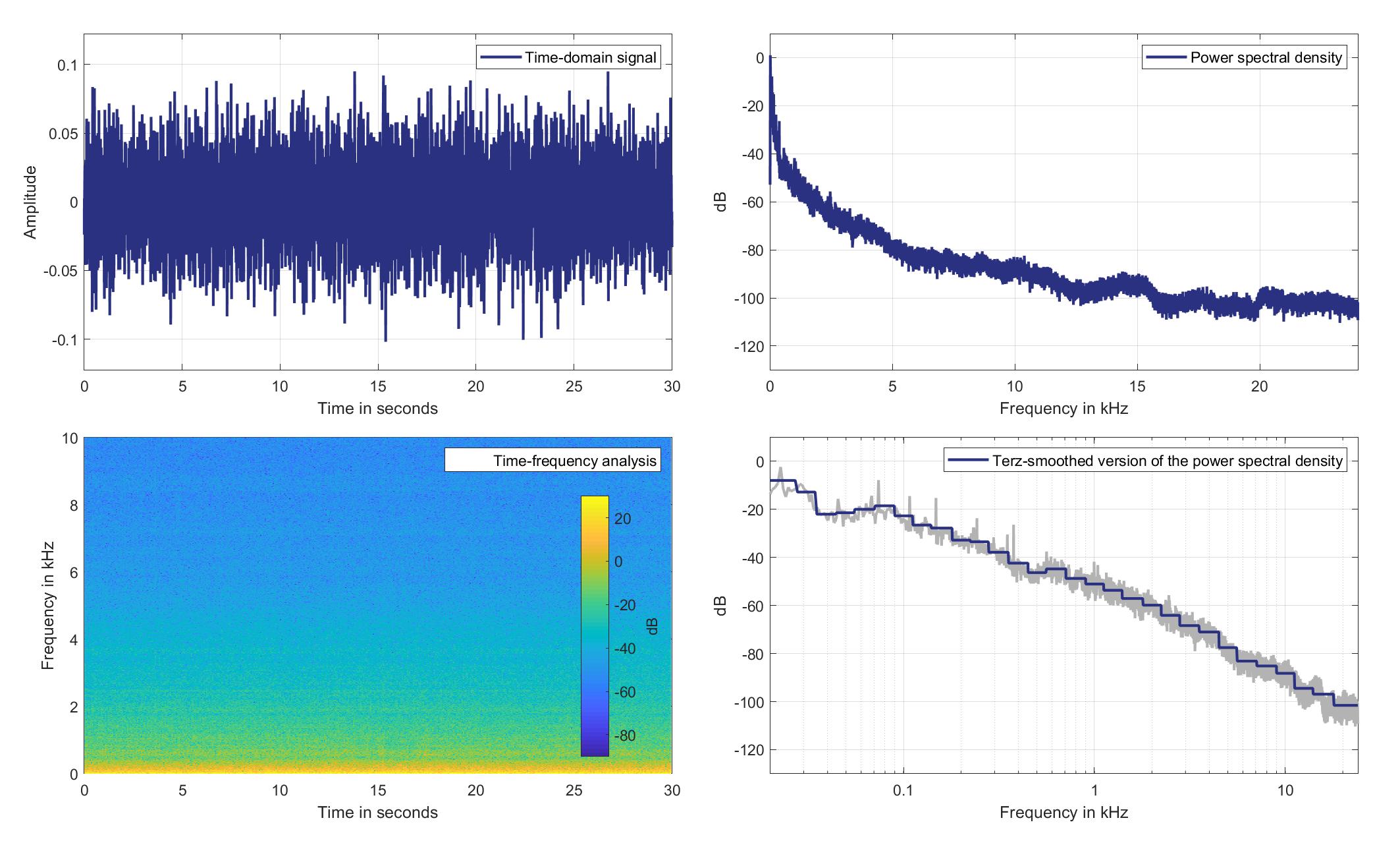 All recordings are presented below in four different analyses per microphone and condition. The first plot shows the time-domain signal and the second one a time-frequency analysis. In the third diagram you can see an estimate of the power spectral density and the last one shows the terz-smoothed version of the power spectral density. Furthermore, you can listen to each noise example for each microphone and situation. The wav files can be downloaded below as single files or in a zipped version of all files in the section "Downloads".