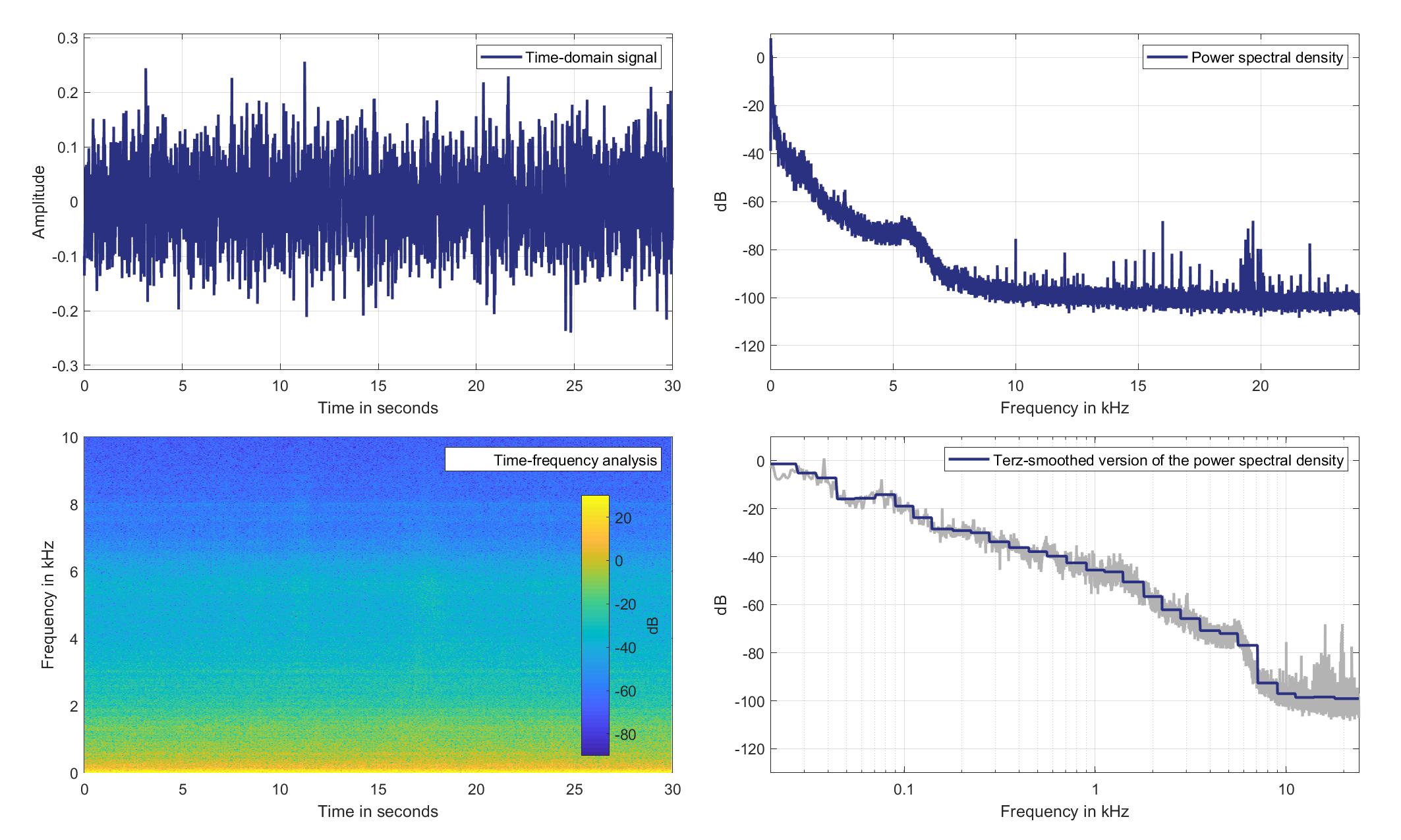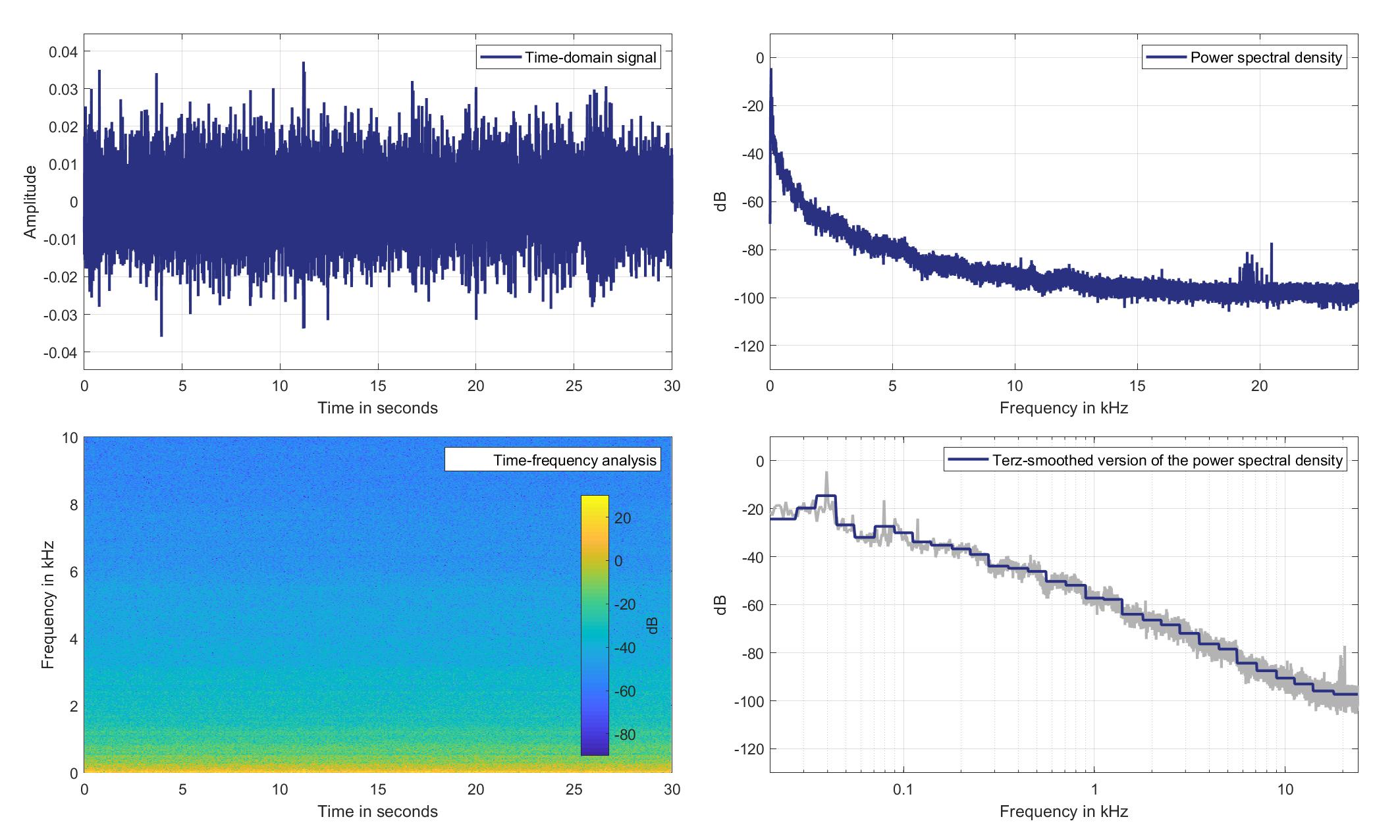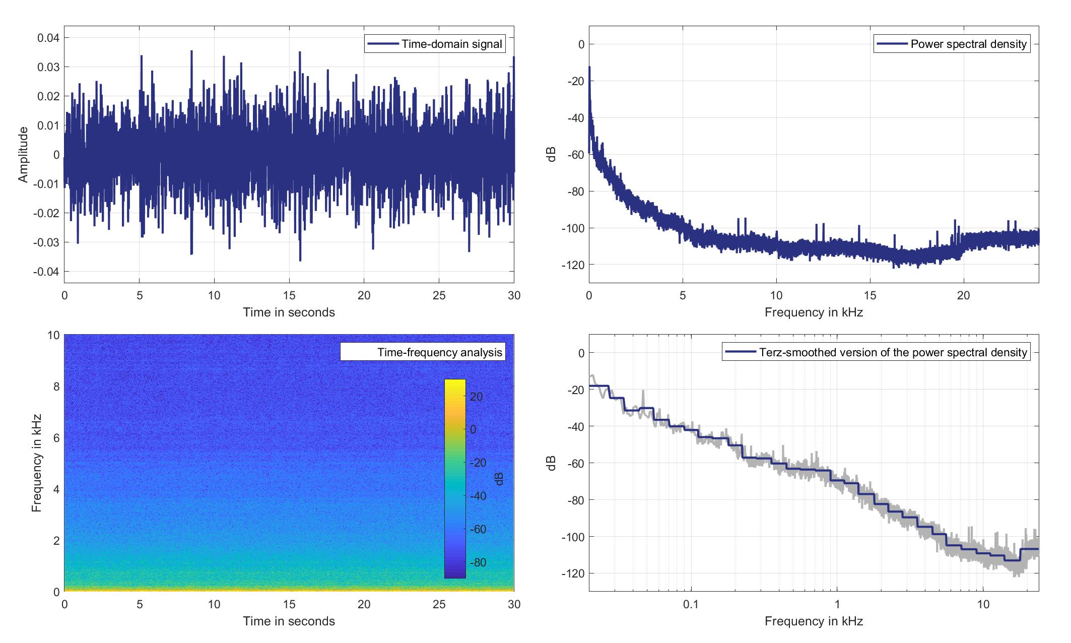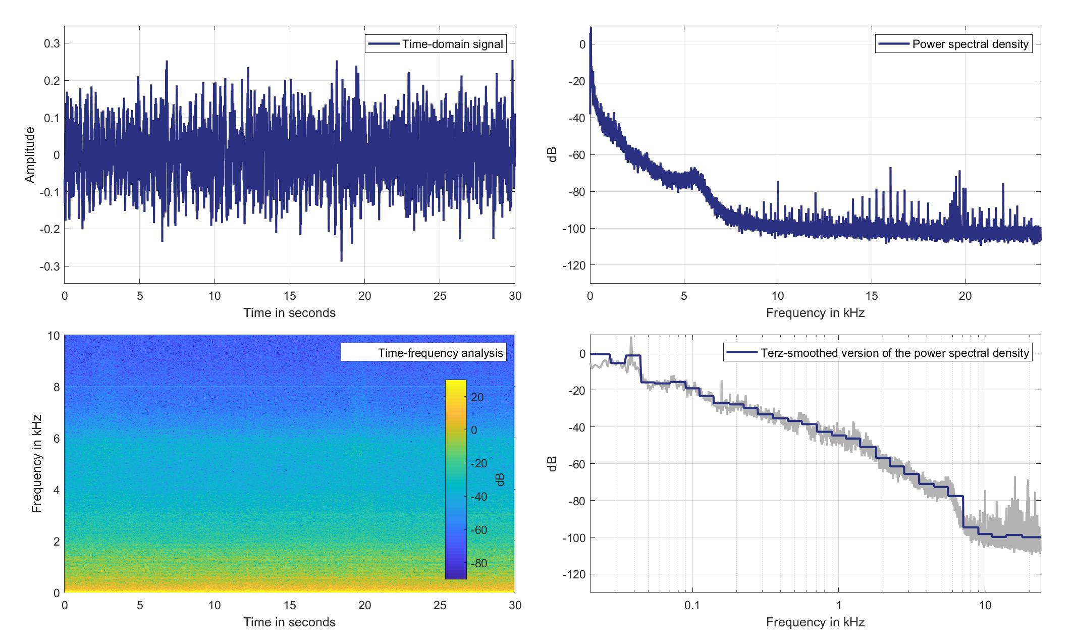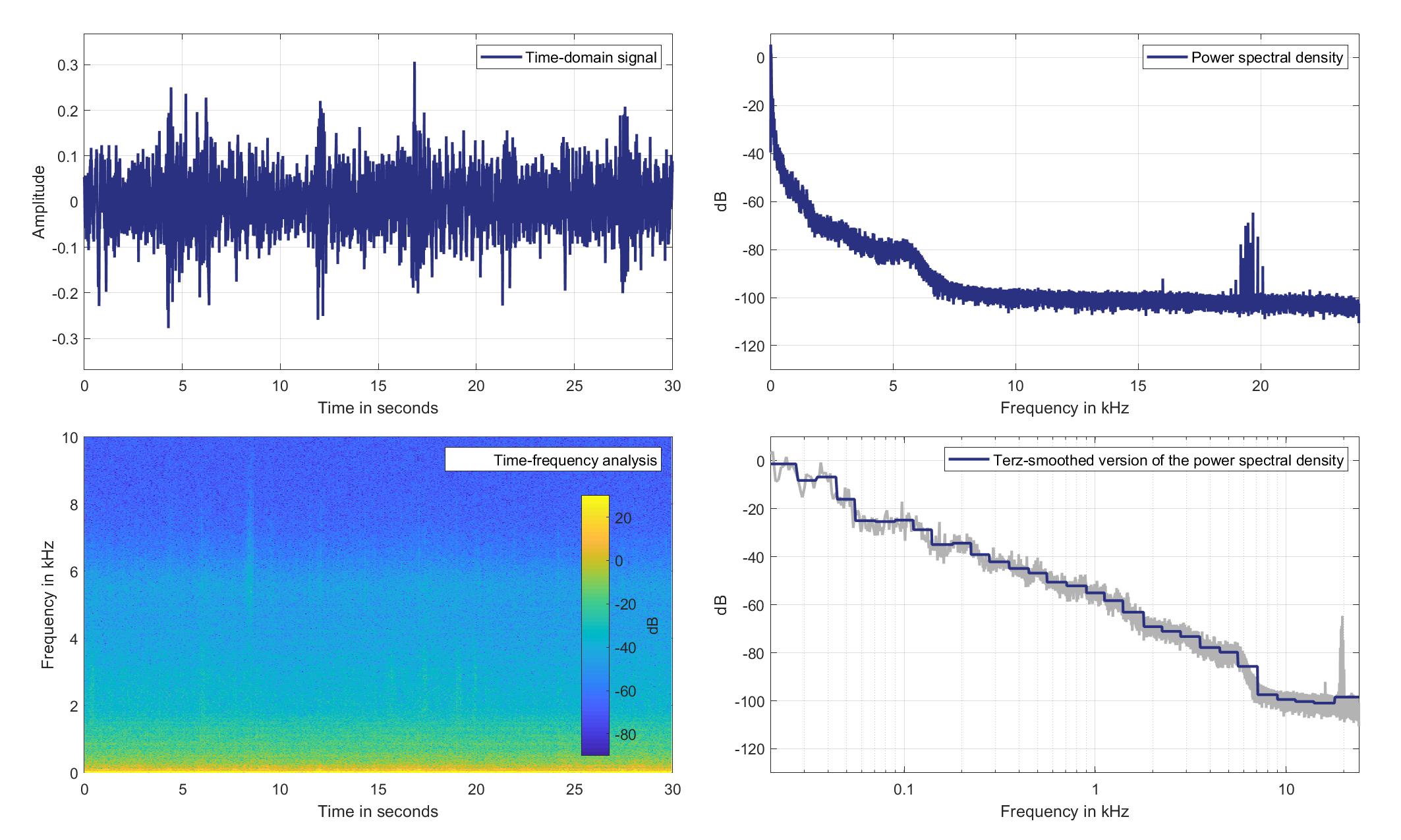 All recordings are presented below in four different analyses per microphone and condition. The first plot shows the time-domain signal and the second one a time-frequency analysis. In the third diagram you can see an estimate of the power spectral density and the last one shows the terz-smoothed version of the power spectral density. Furthermore, you can listen to each noise example for each microphone and situation. The wav files can be downloaded below as single files or in a zipped version of all files in the section "Downloads".