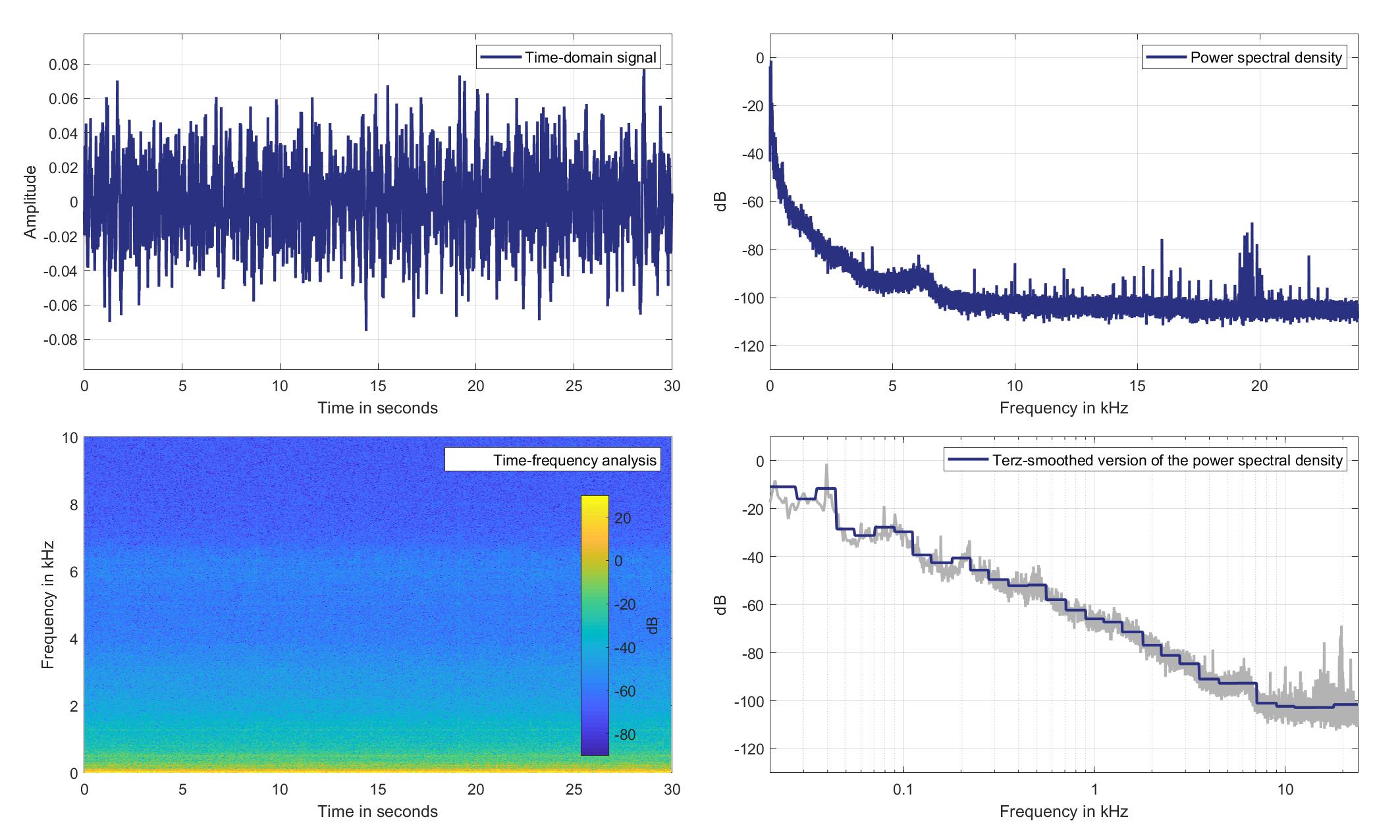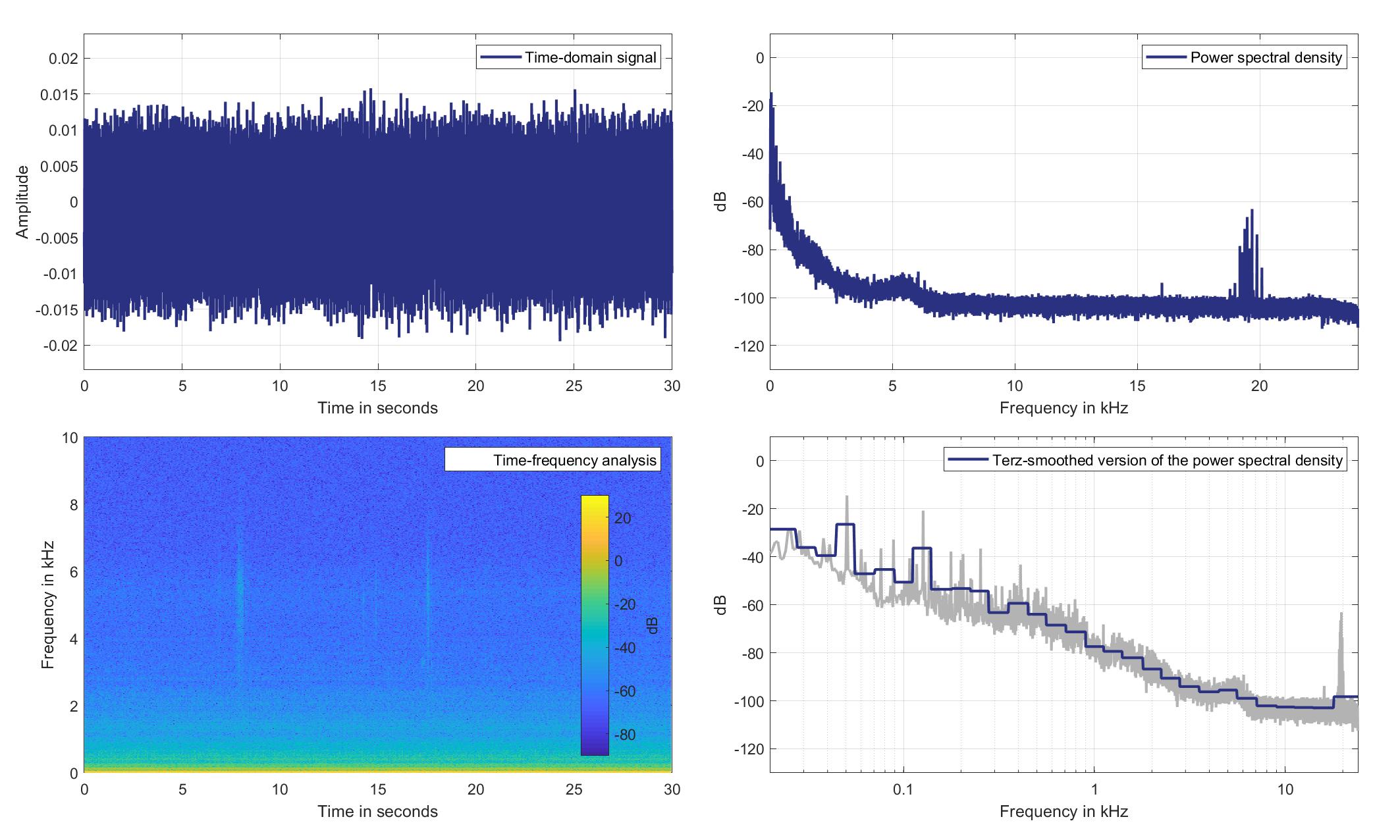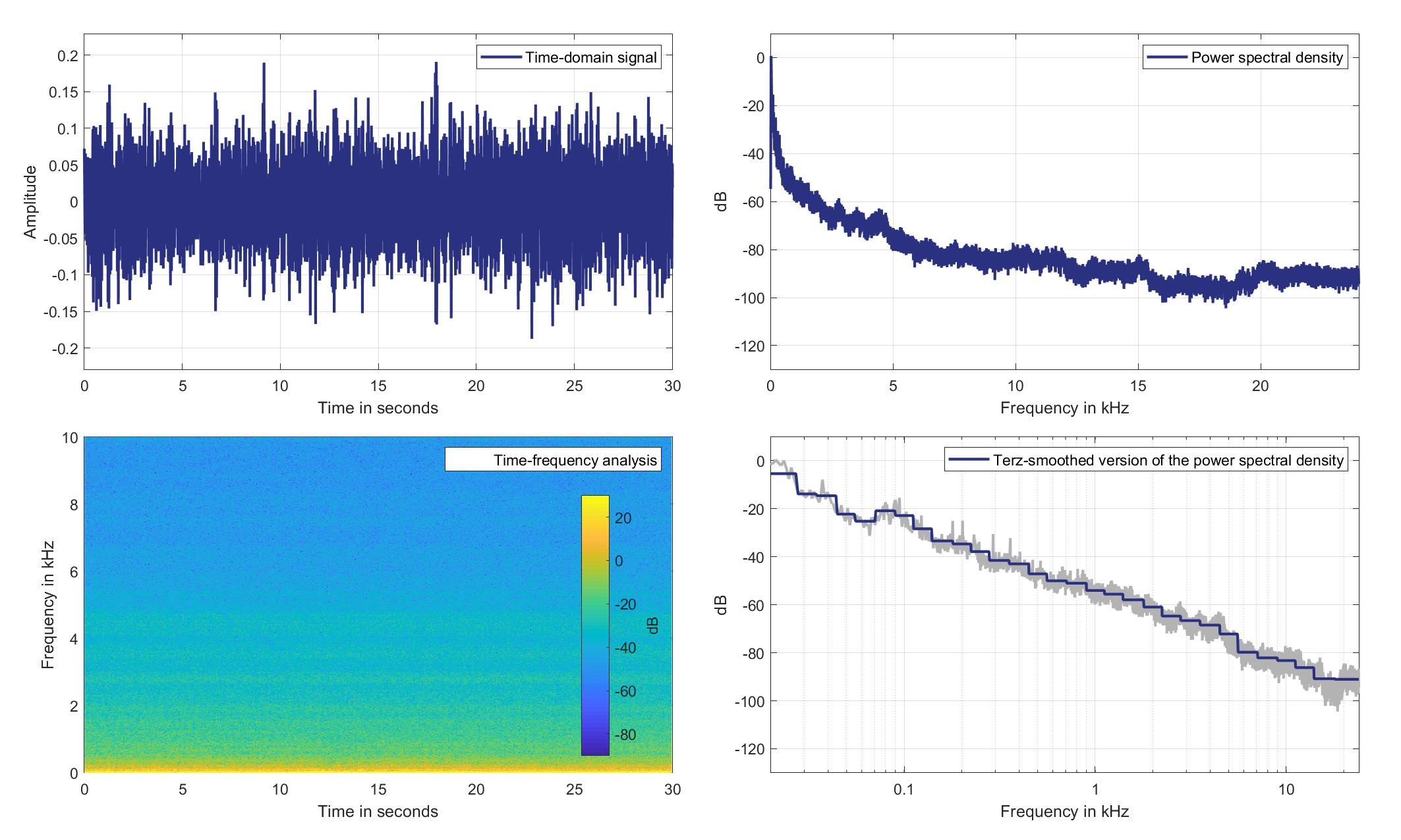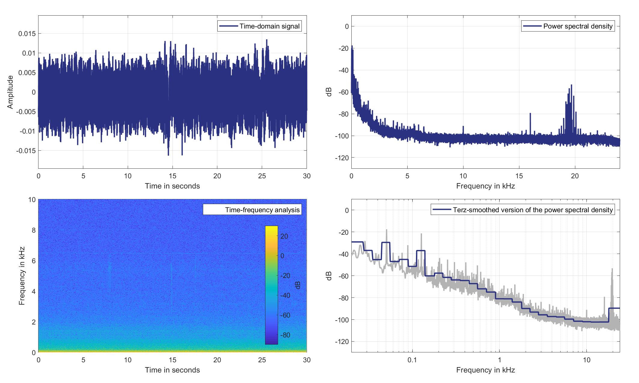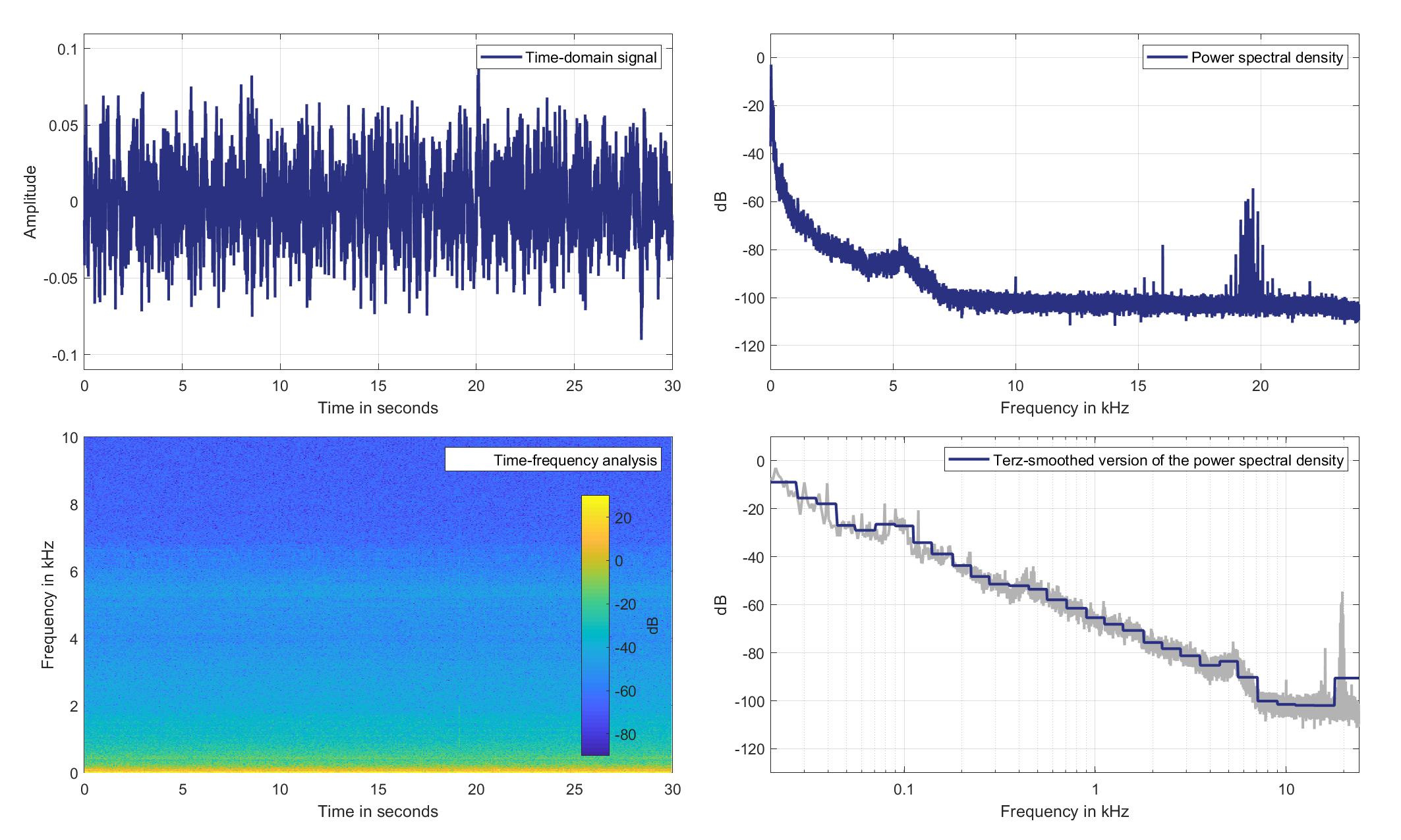 All recordings are presented below in four different analyses per microphone and condition. The first plot shows the time-domain signal and the second one a time-frequency analysis. In the third diagram you can see an estimate of the power spectral density and the last one shows the terz-smoothed version of the power spectral density. Furthermore, you can listen to each noise example for each microphone and situation. The wav files can be downloaded below as single files or in a zipped version of all files in the section "Downloads".