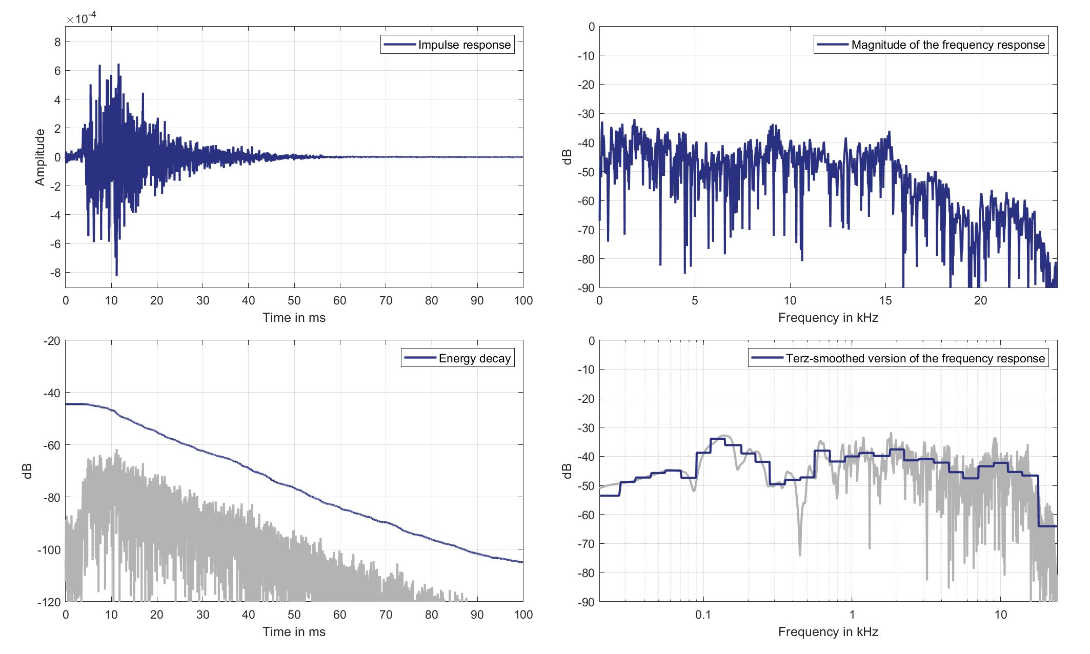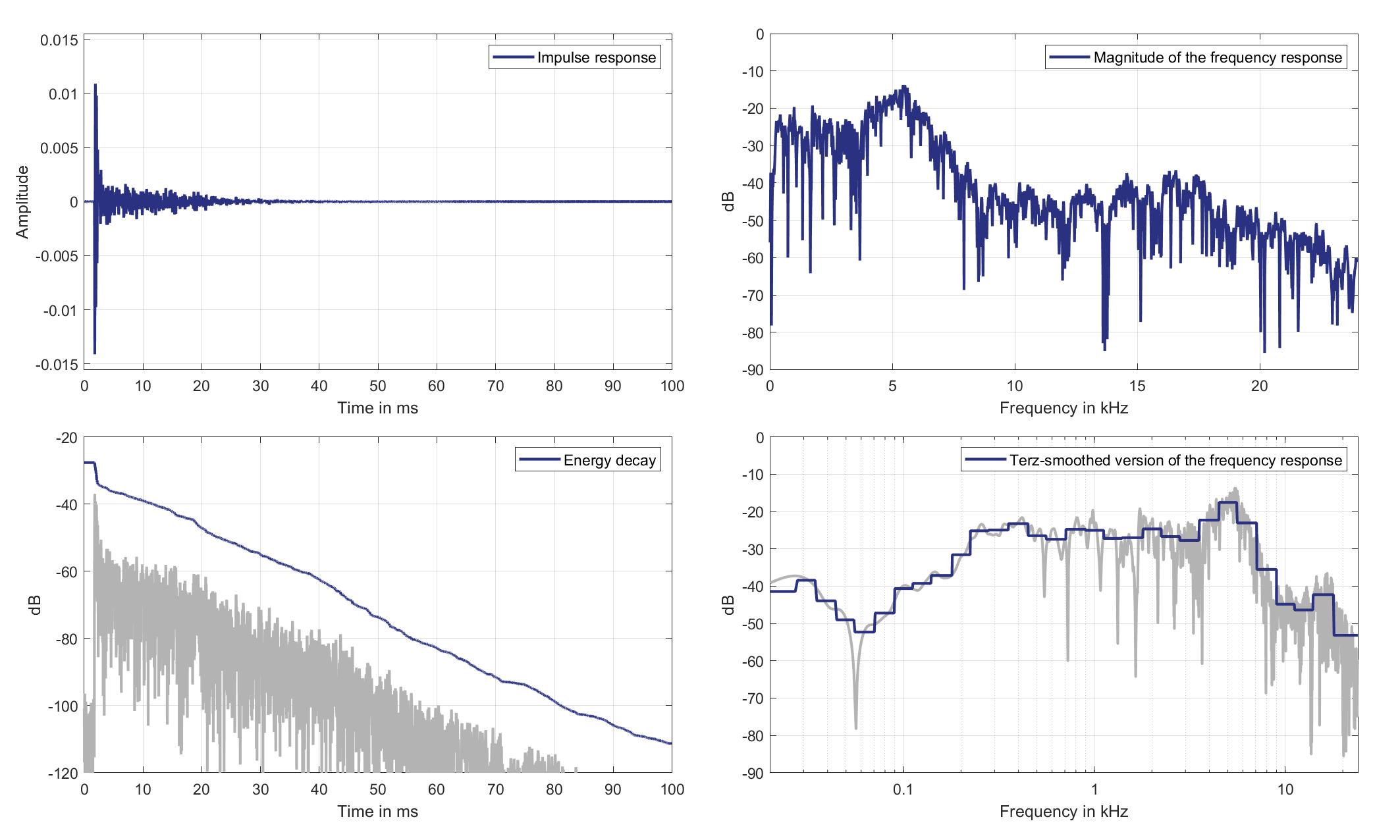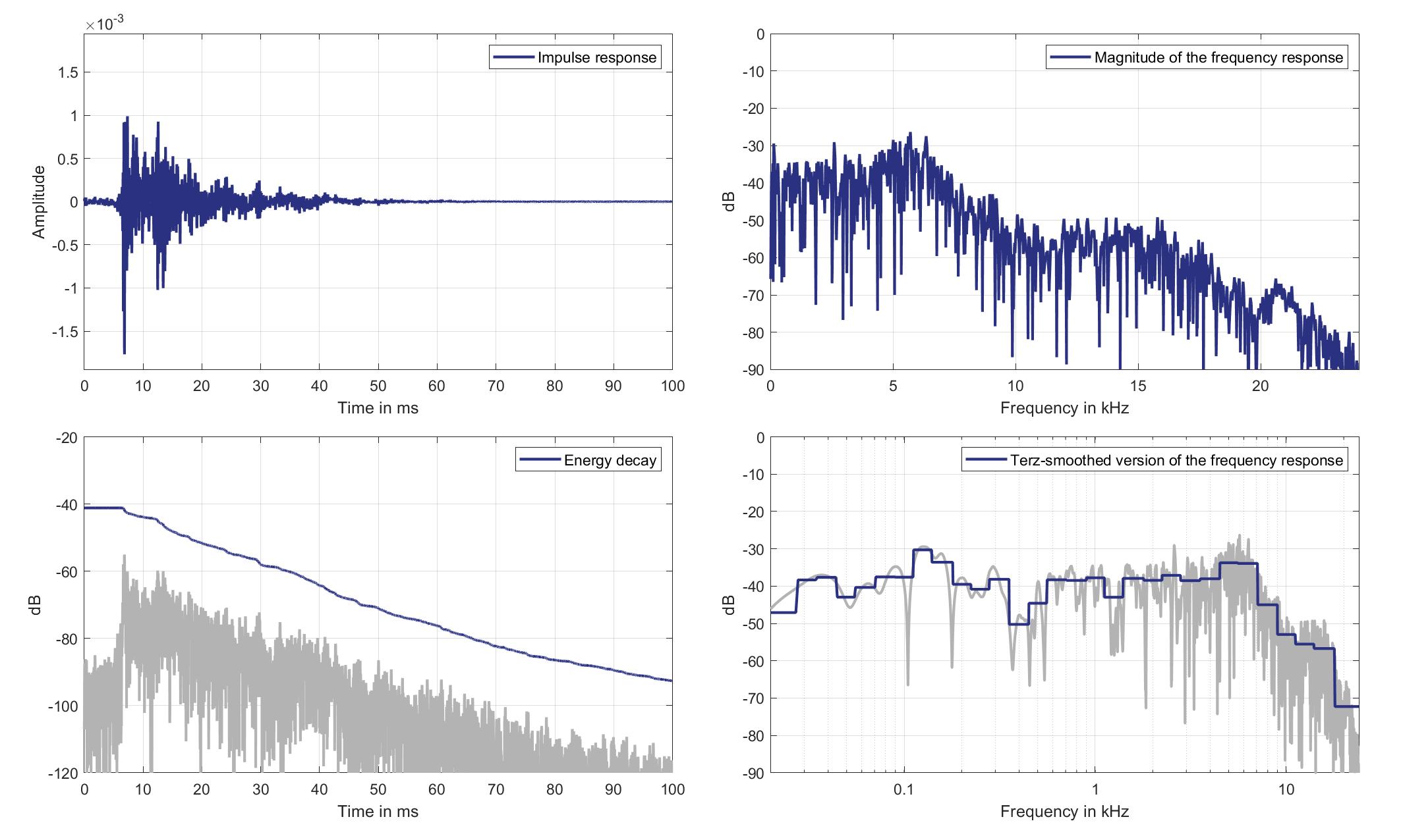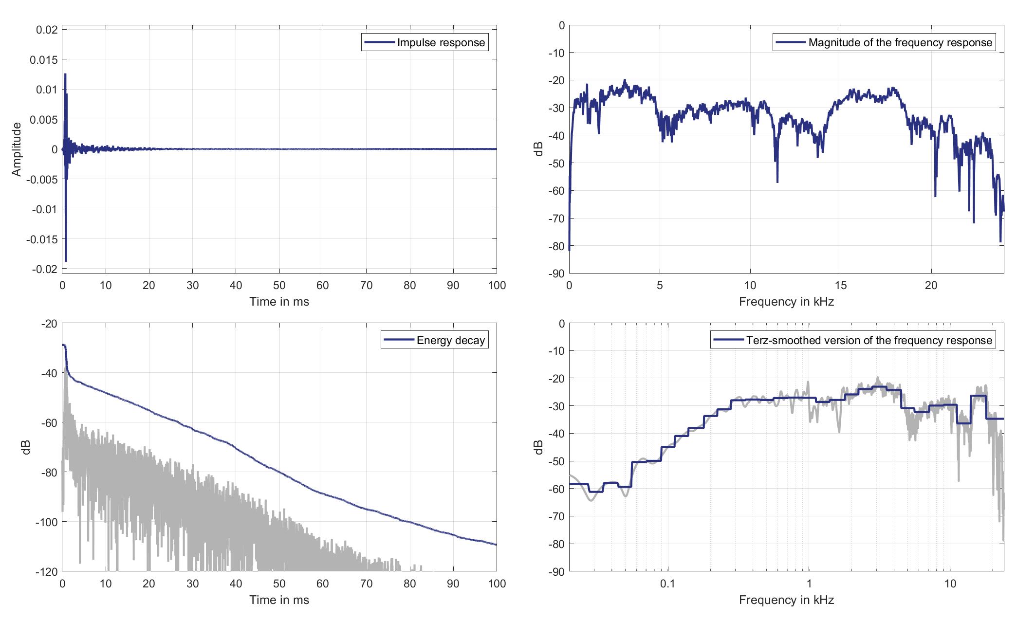 In below visualization of the impulse responses, the impulse responses are grouped by loudspeaker and microphone categories. The analyses provided show the impulse responses in the time domain, both an un-smoothed and a terz-smoothed version of the magnitude frequency responses, and the energy-decay curves. You can download the impulse responses individually on this page or all of them together as a zip file in the download section.