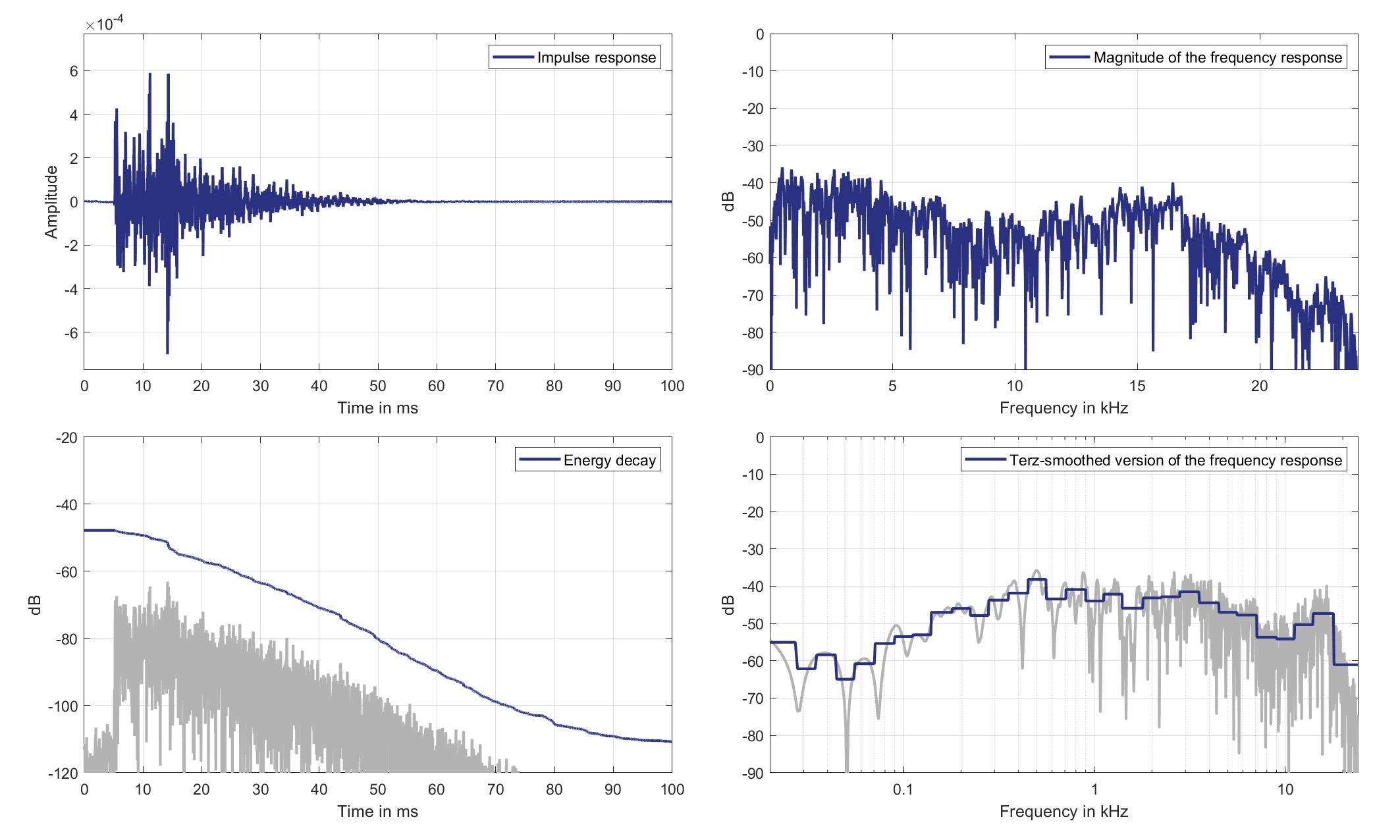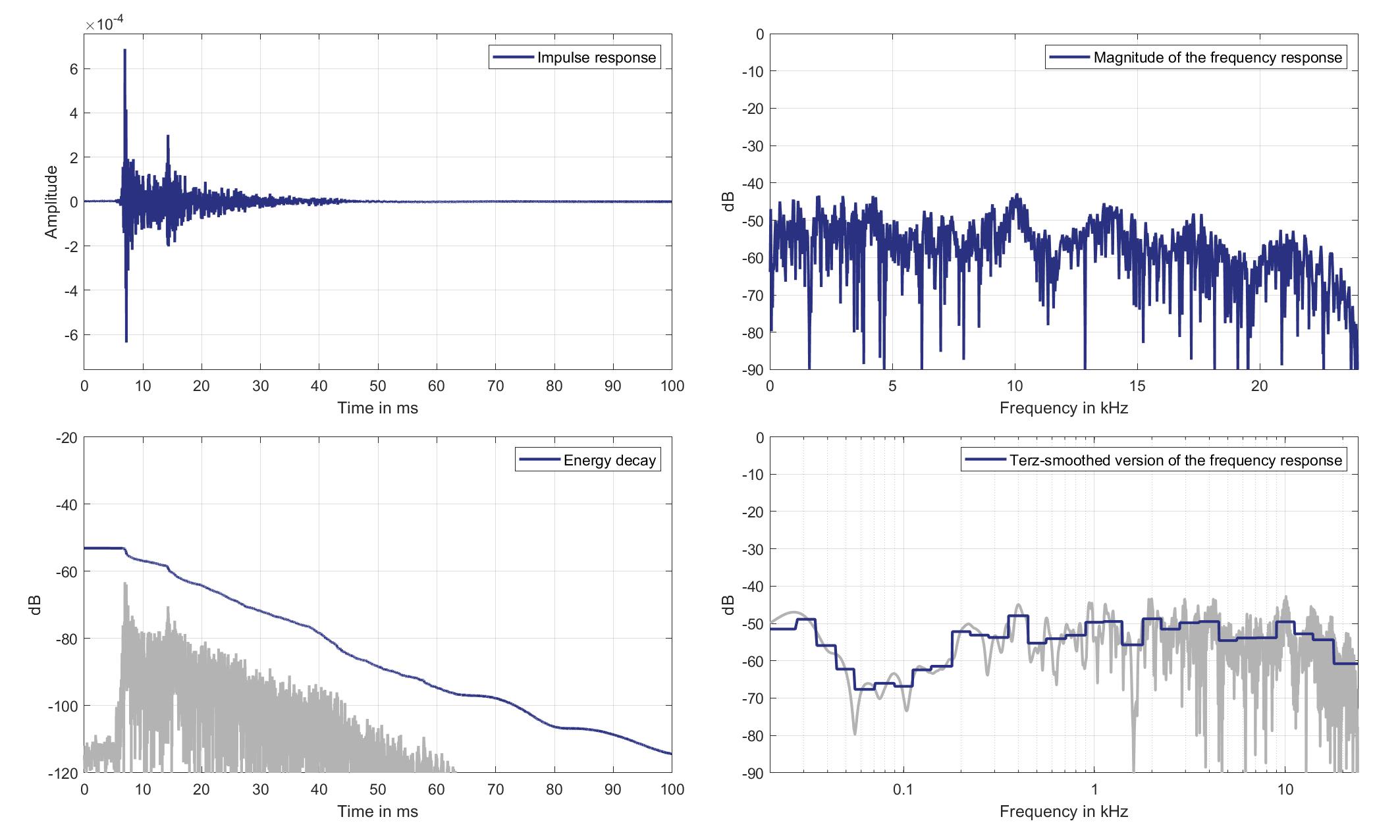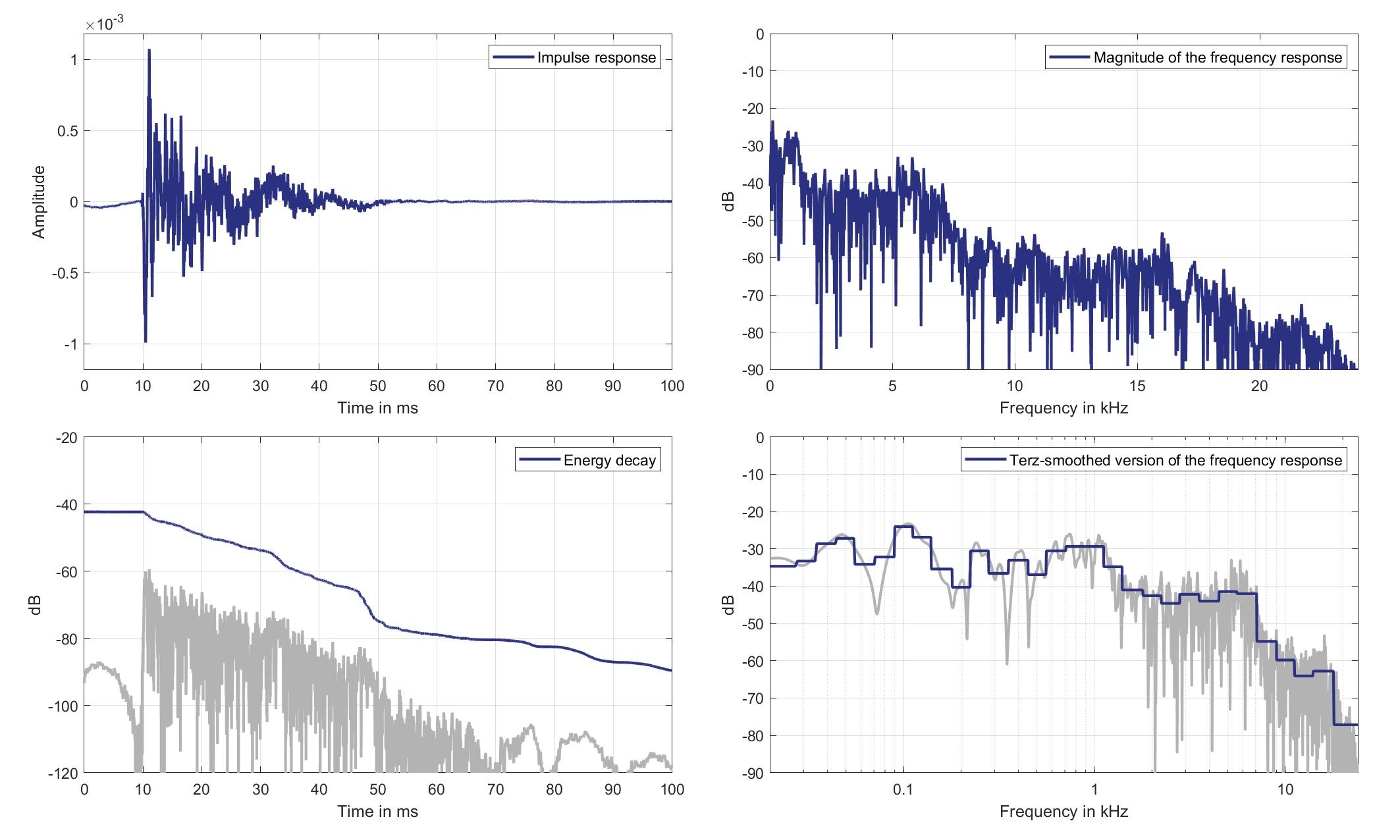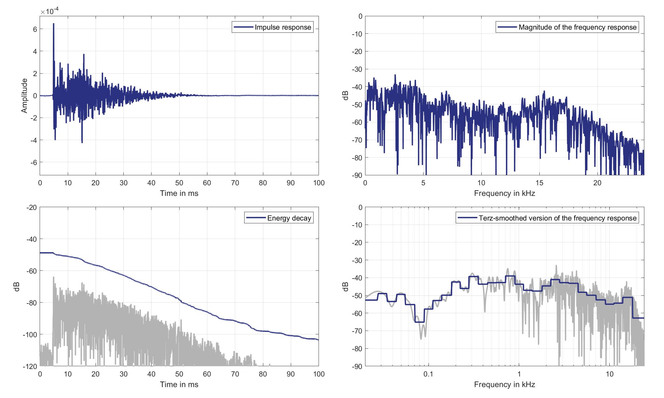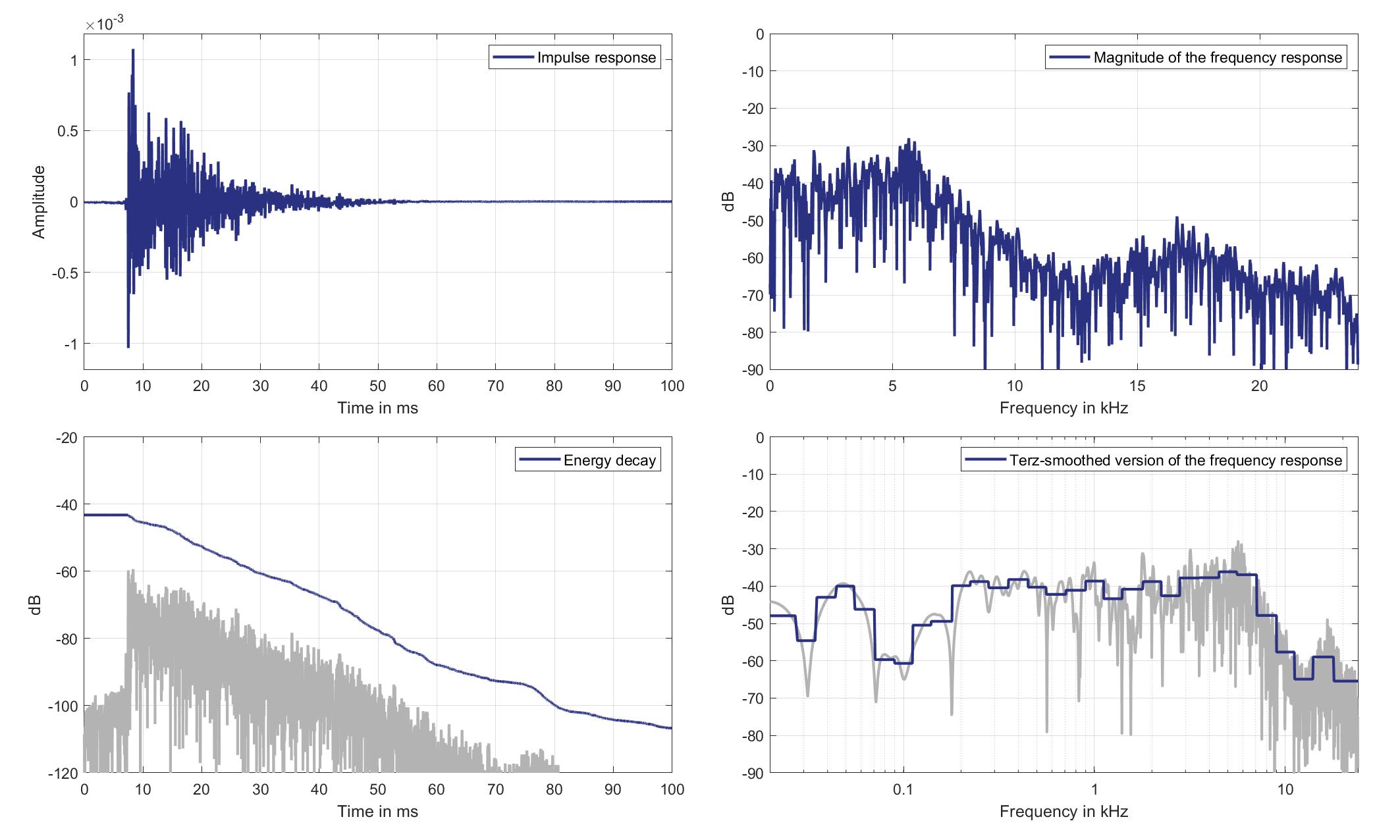 In below visualization of the impulse responses, the impulse responses are grouped by loudspeaker and microphone categories. The analyses provided show the impulse responses in the time domain, both an un-smoothed and a terz-smoothed version of the magnitude frequency responses, and the energy-decay curves. You can download the impulse responses individually on this page or all of them together as a zip file in the download section.