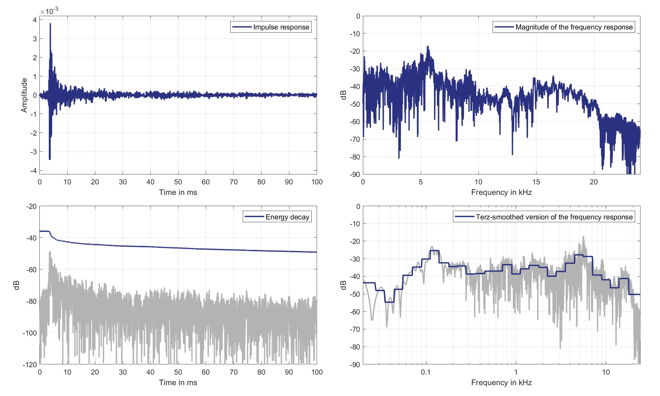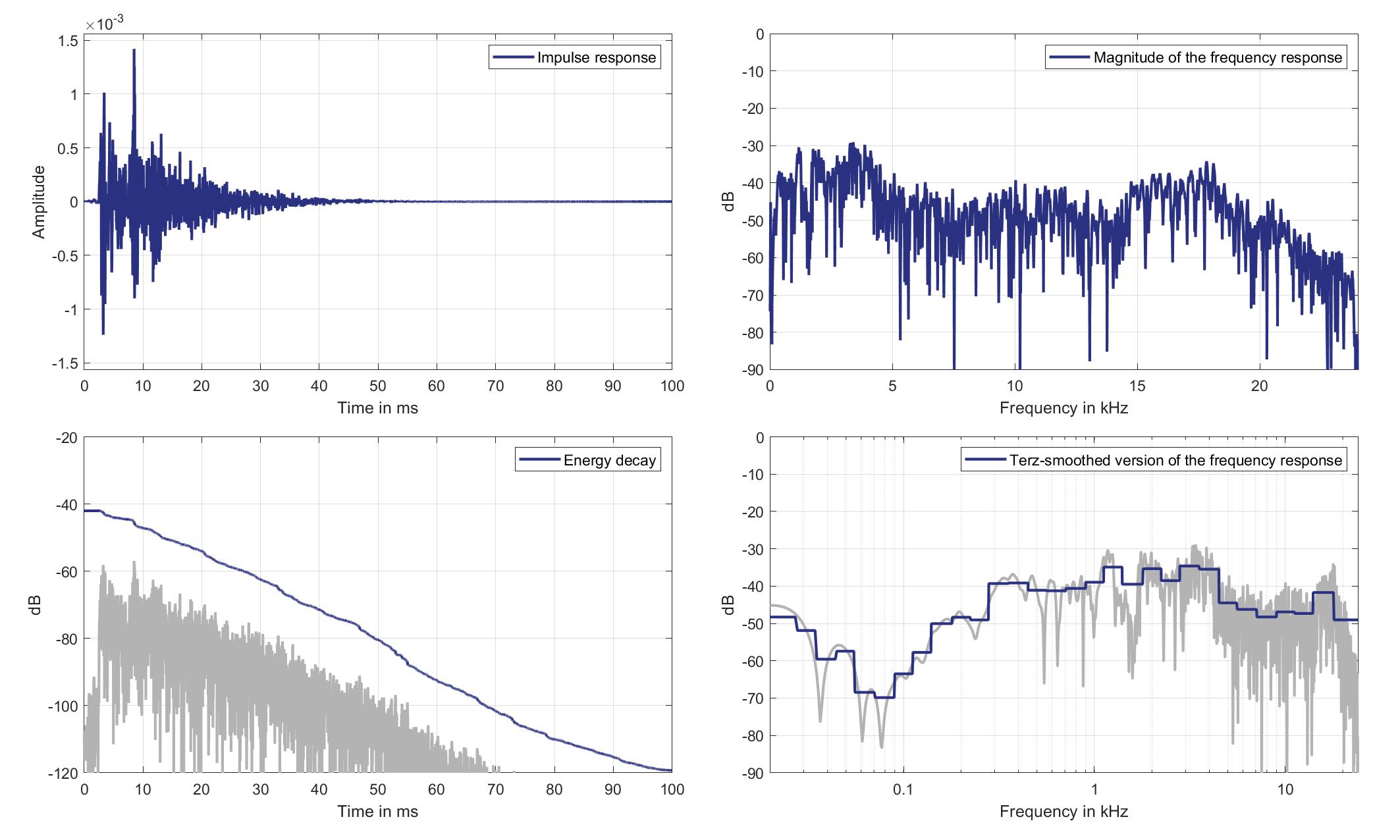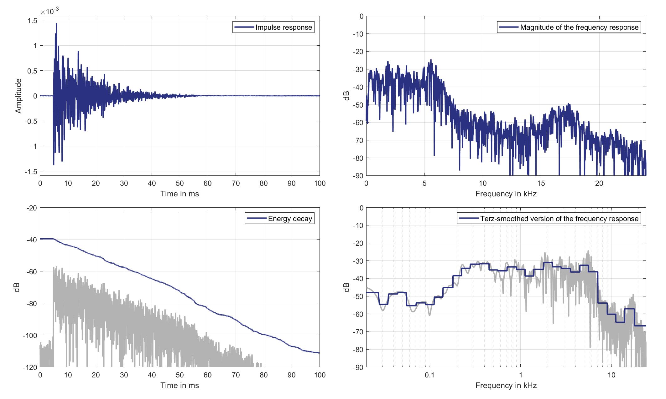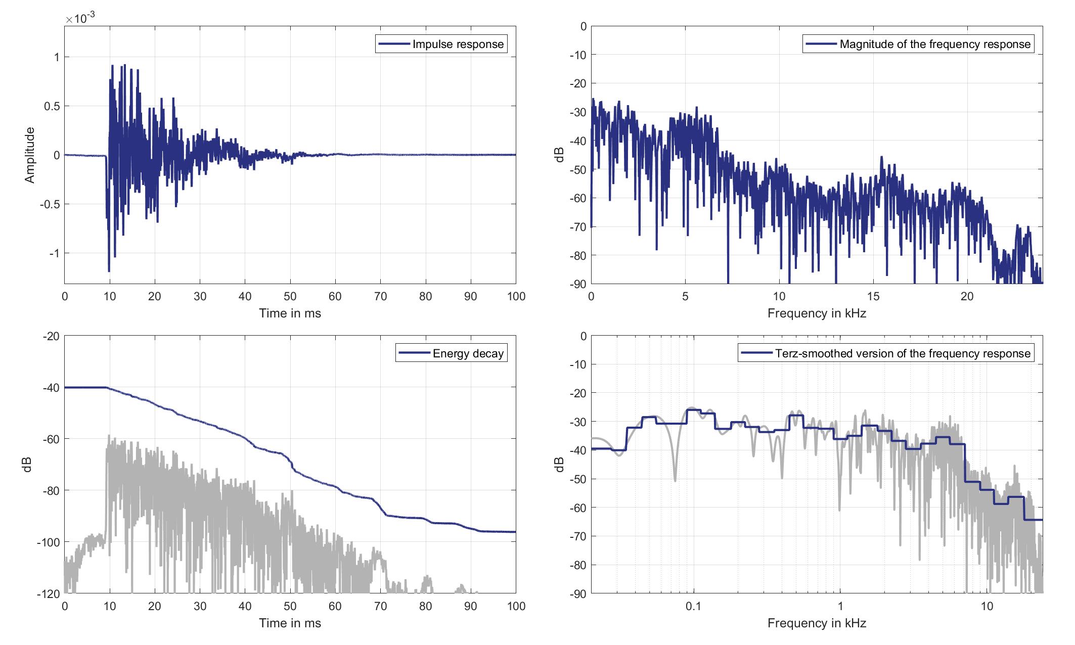 In below visualization of the impulse responses, the impulse responses are grouped by loudspeaker and microphone categories. The analyses provided show the impulse responses in the time domain, both an un-smoothed and a terz-smoothed version of the magnitude frequency responses, and the energy-decay curves. You can download the impulse responses individually on this page or all of them together as a zip file in the download section.