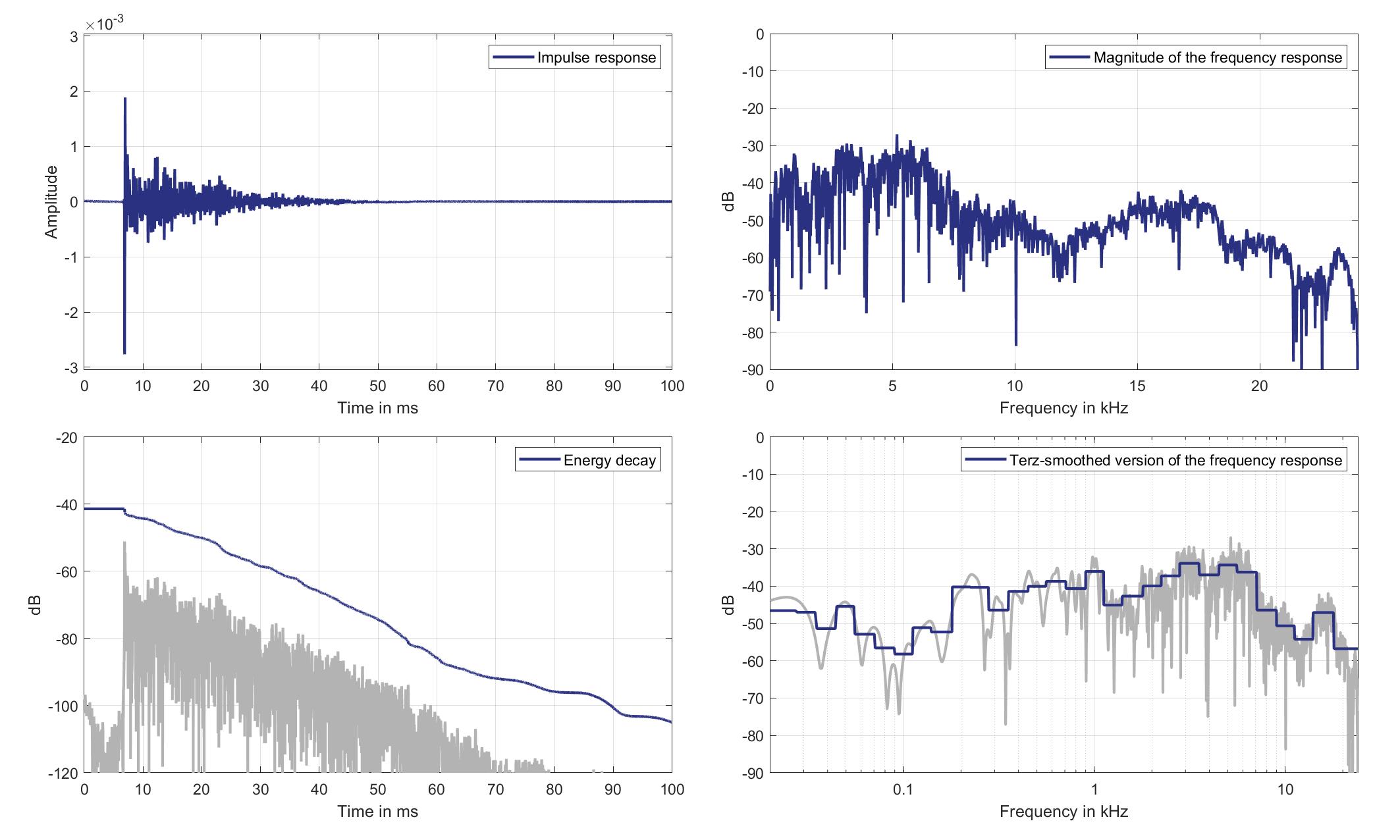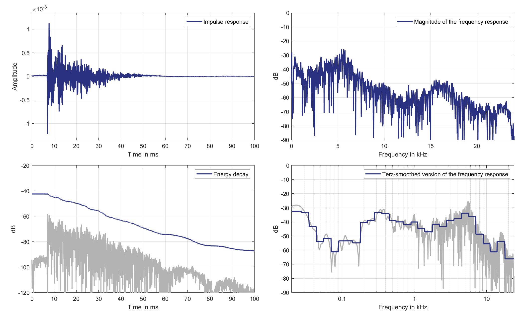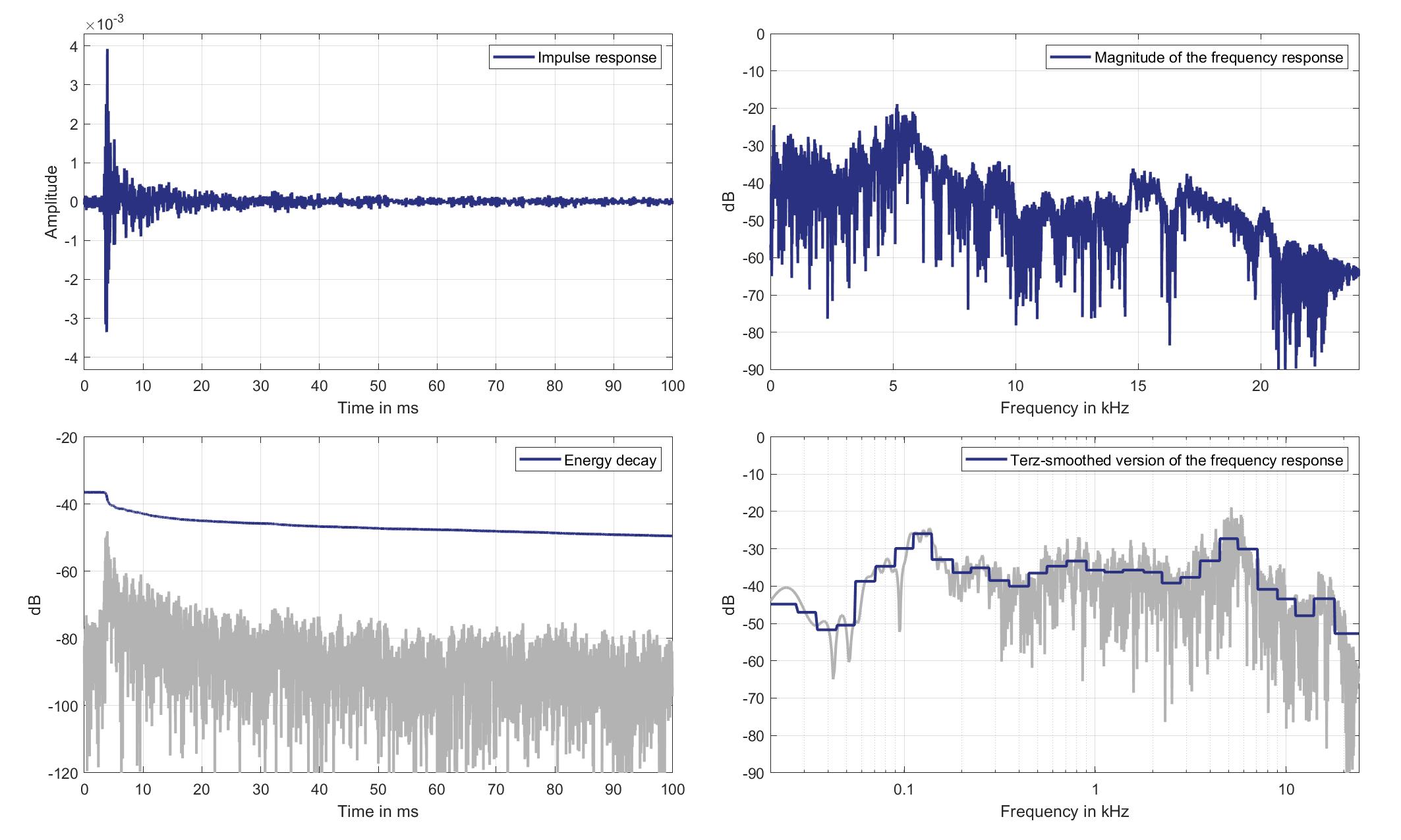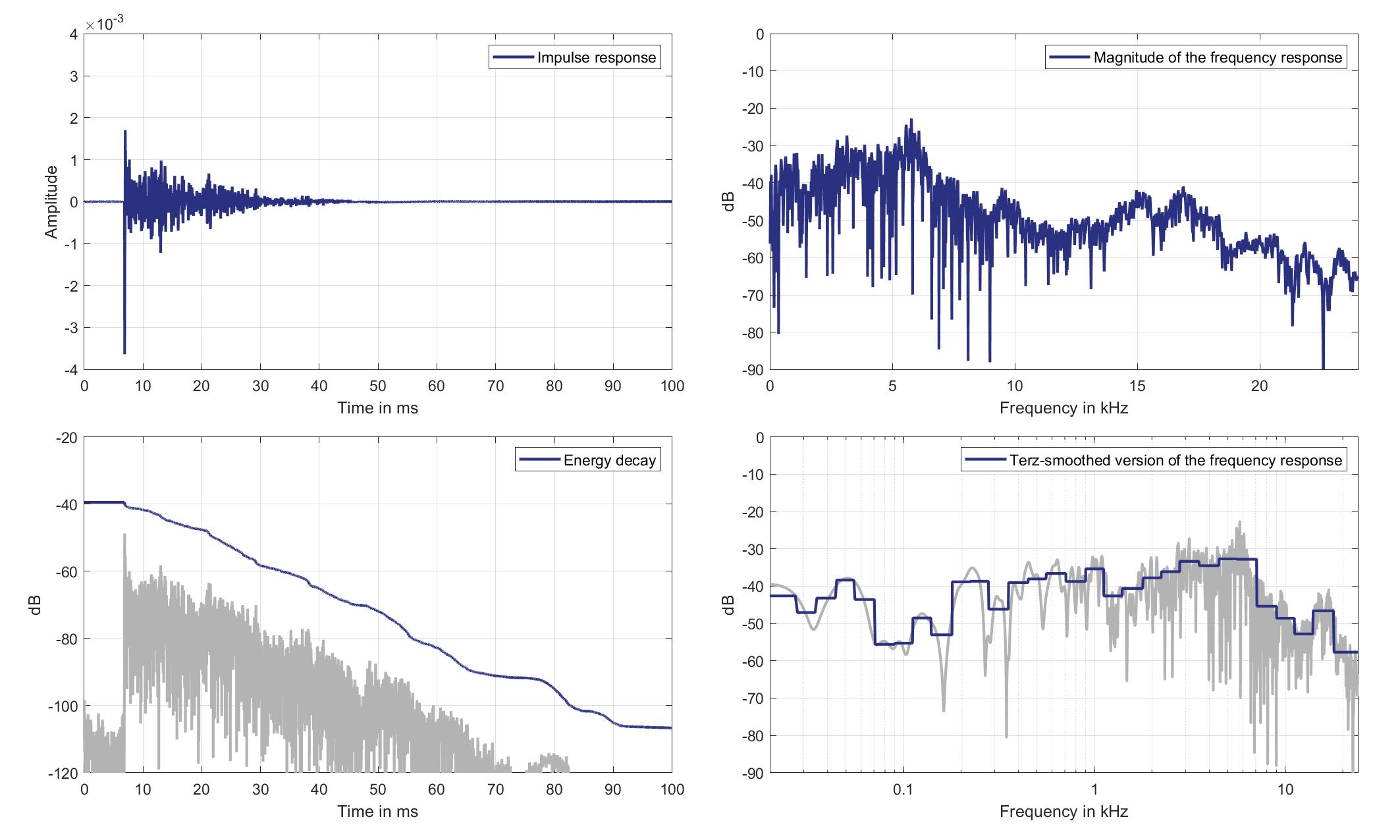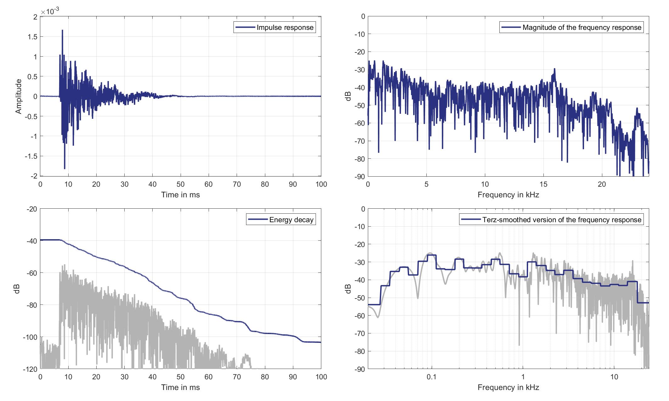 In below visualization of the impulse responses, the impulse responses are grouped by loudspeaker and microphone categories. The analyses provided show the impulse responses in the time domain, both an un-smoothed and a terz-smoothed version of the magnitude frequency responses, and the energy-decay curves. You can download the impulse responses individually on this page or all of them together as a zip file in the download section.