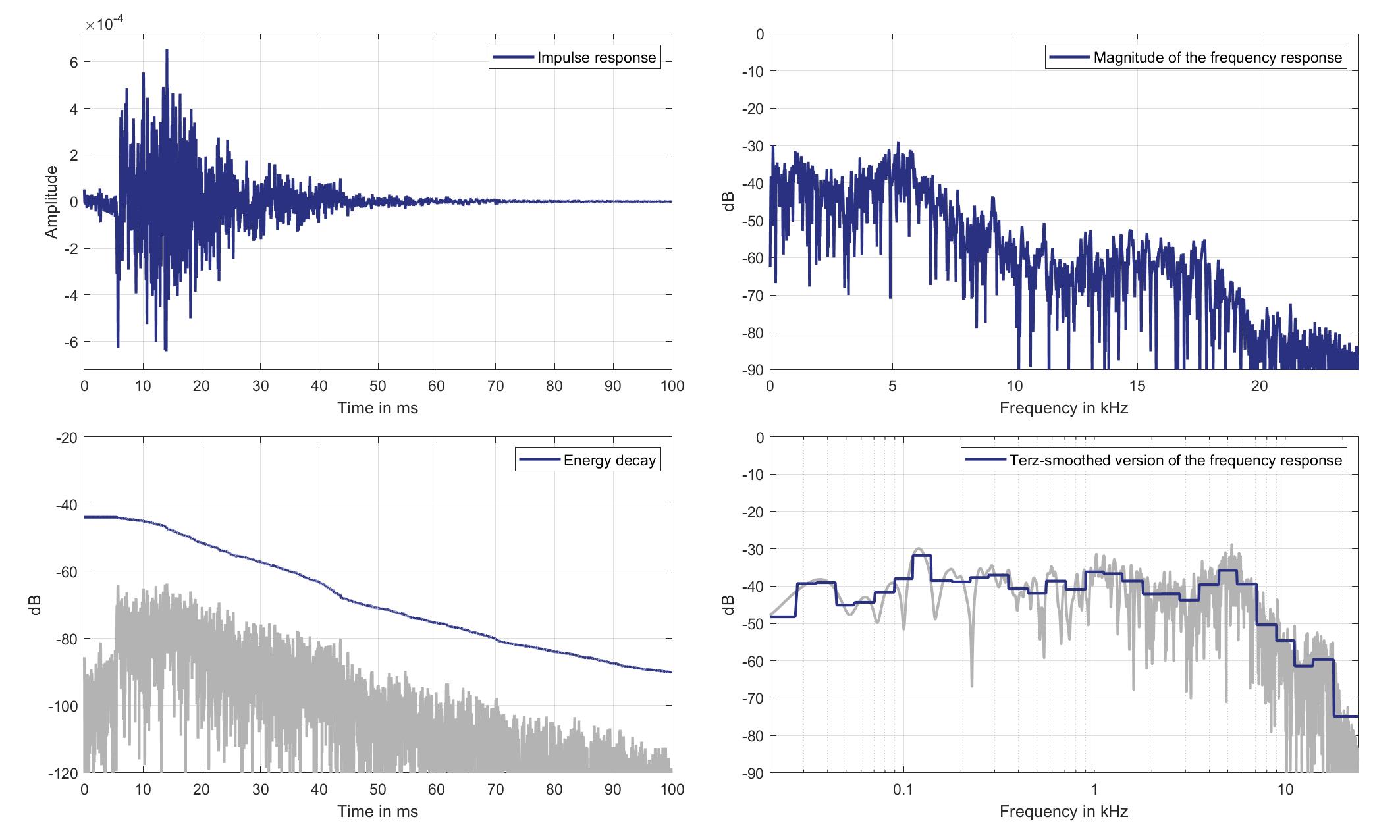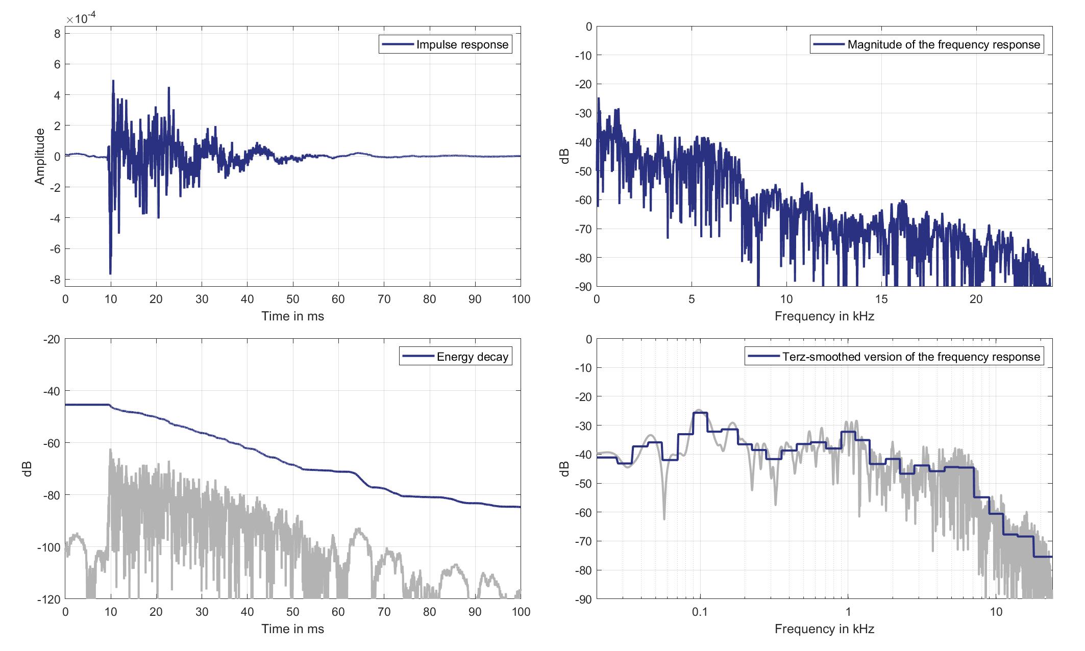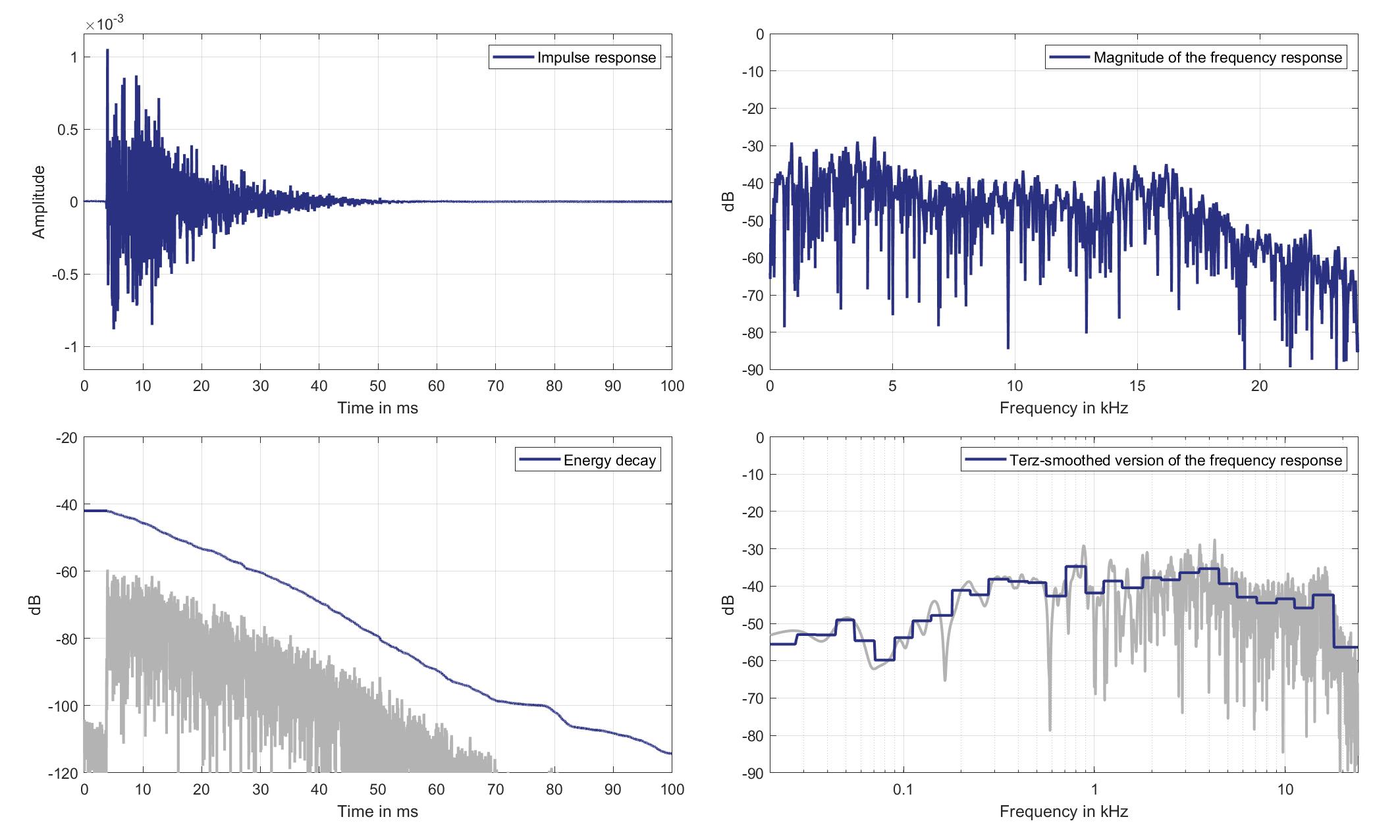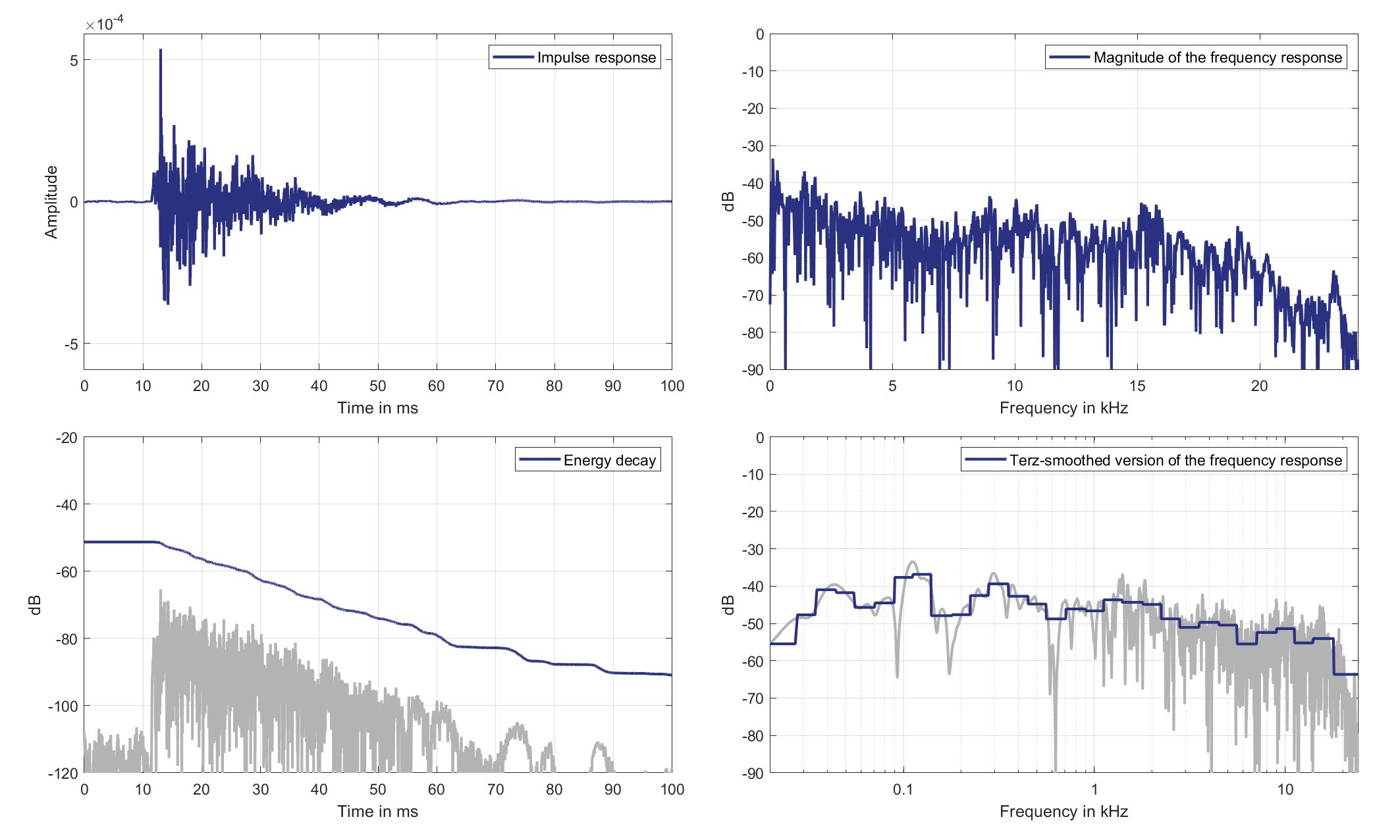 In below visualization of the impulse responses, the impulse responses are grouped by loudspeaker and microphone categories. The analyses provided show the impulse responses in the time domain, both an un-smoothed and a terz-smoothed version of the magnitude frequency responses, and the energy-decay curves. You can download the impulse responses individually on this page or all of them together as a zip file in the download section.