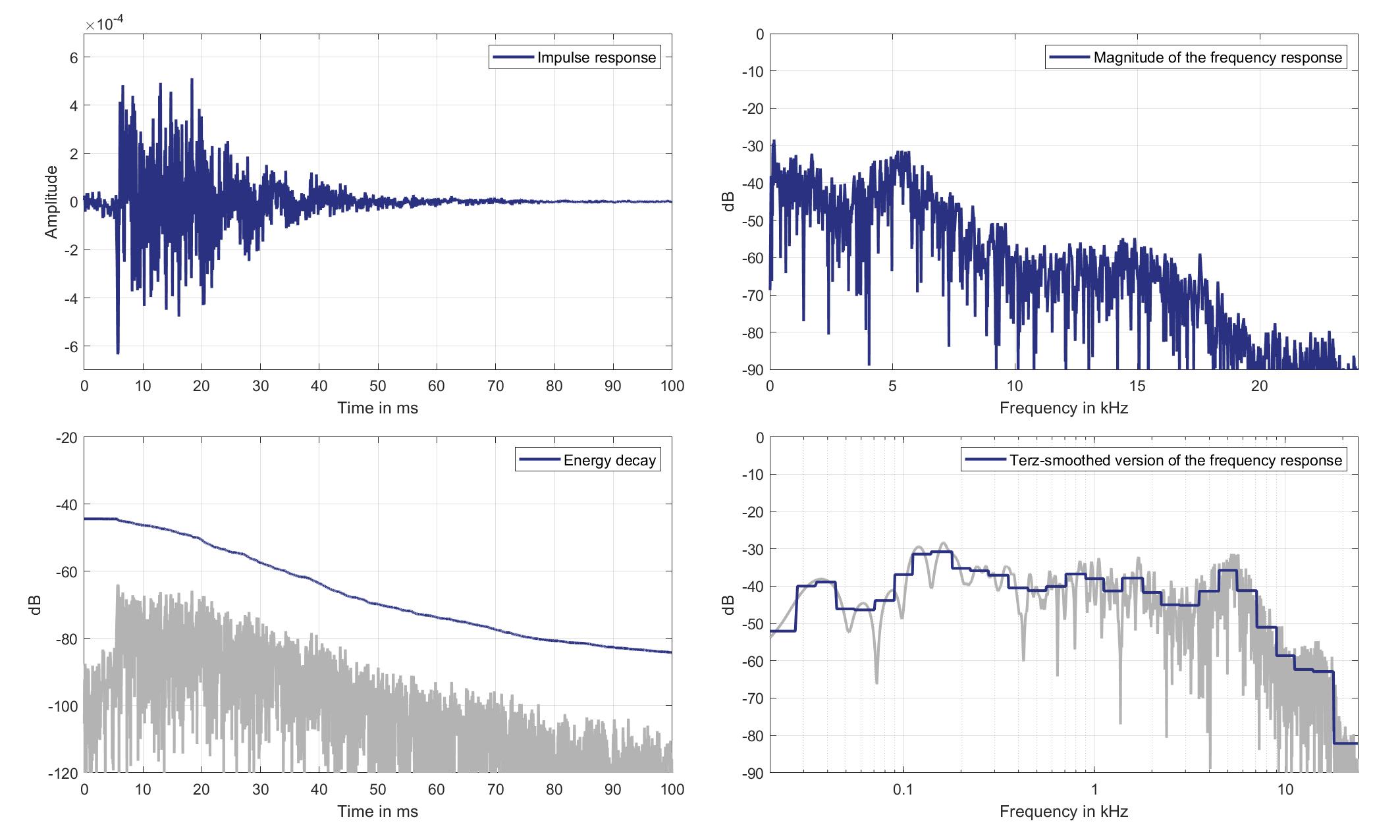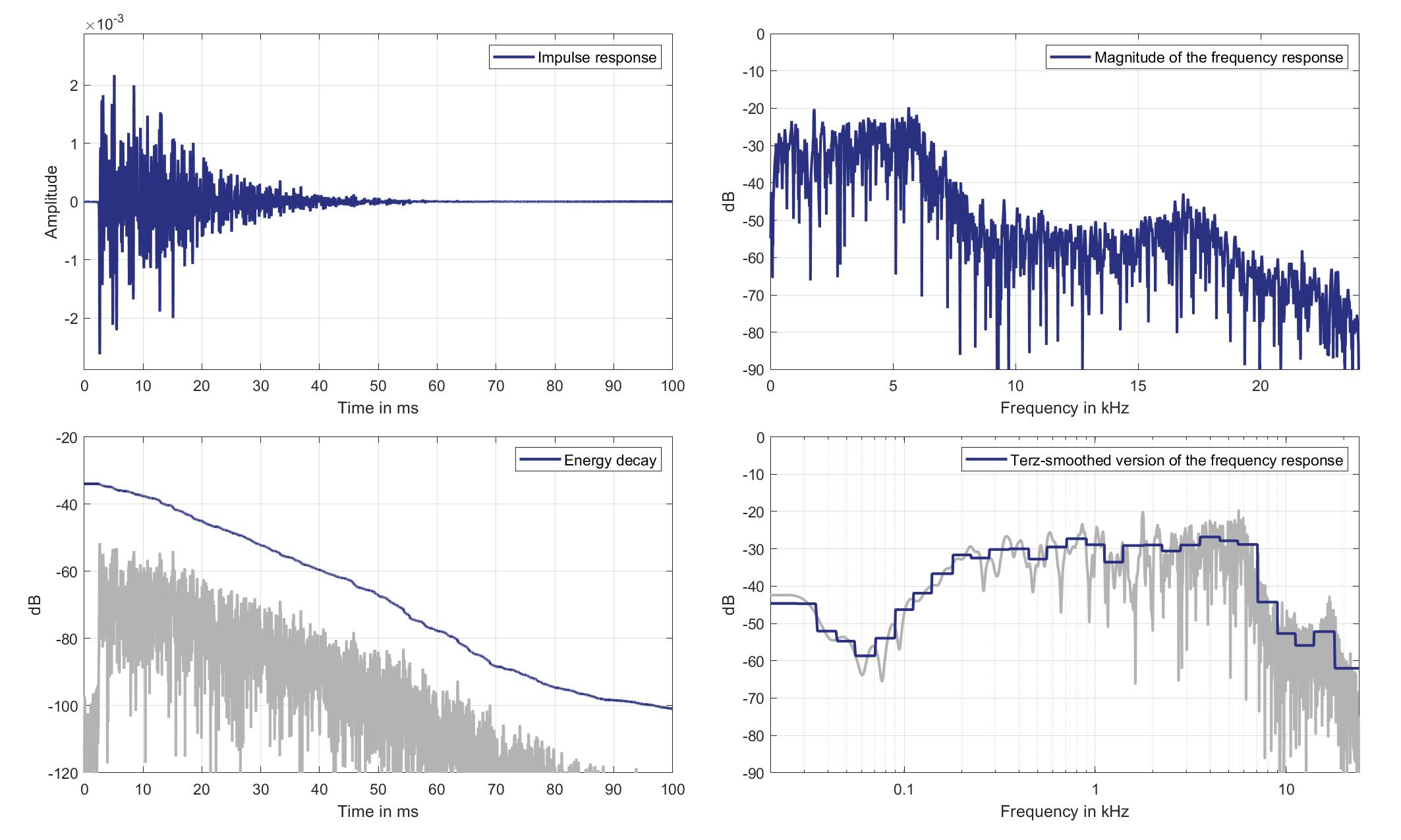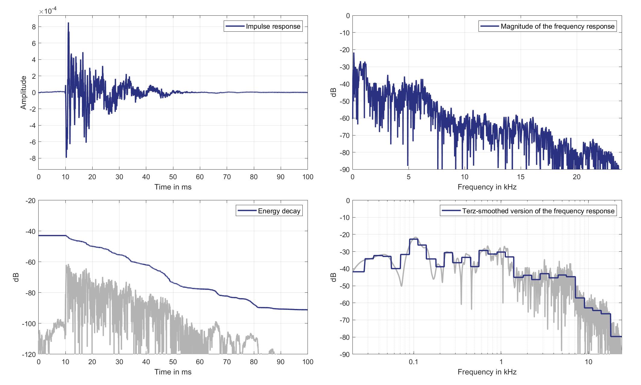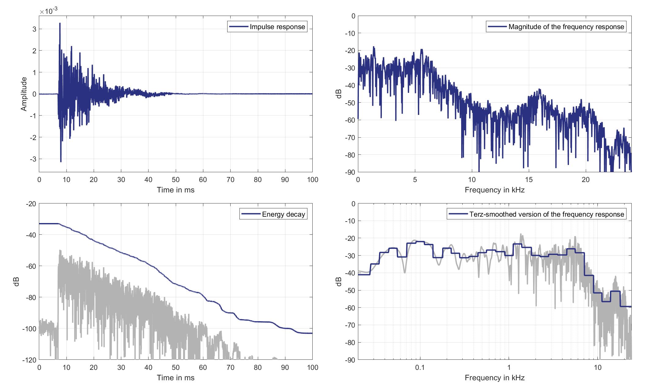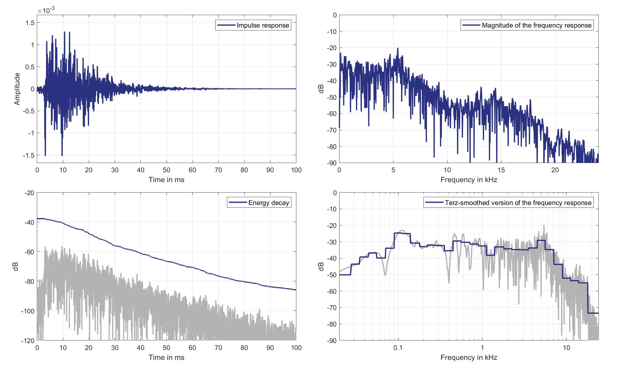 In below visualization of the impulse responses, the impulse responses are grouped by loudspeaker and microphone categories. The analyses provided show the impulse responses in the time domain, both an un-smoothed and a terz-smoothed version of the magnitude frequency responses, and the energy-decay curves. You can download the impulse responses individually on this page or all of them together as a zip file in the download section.